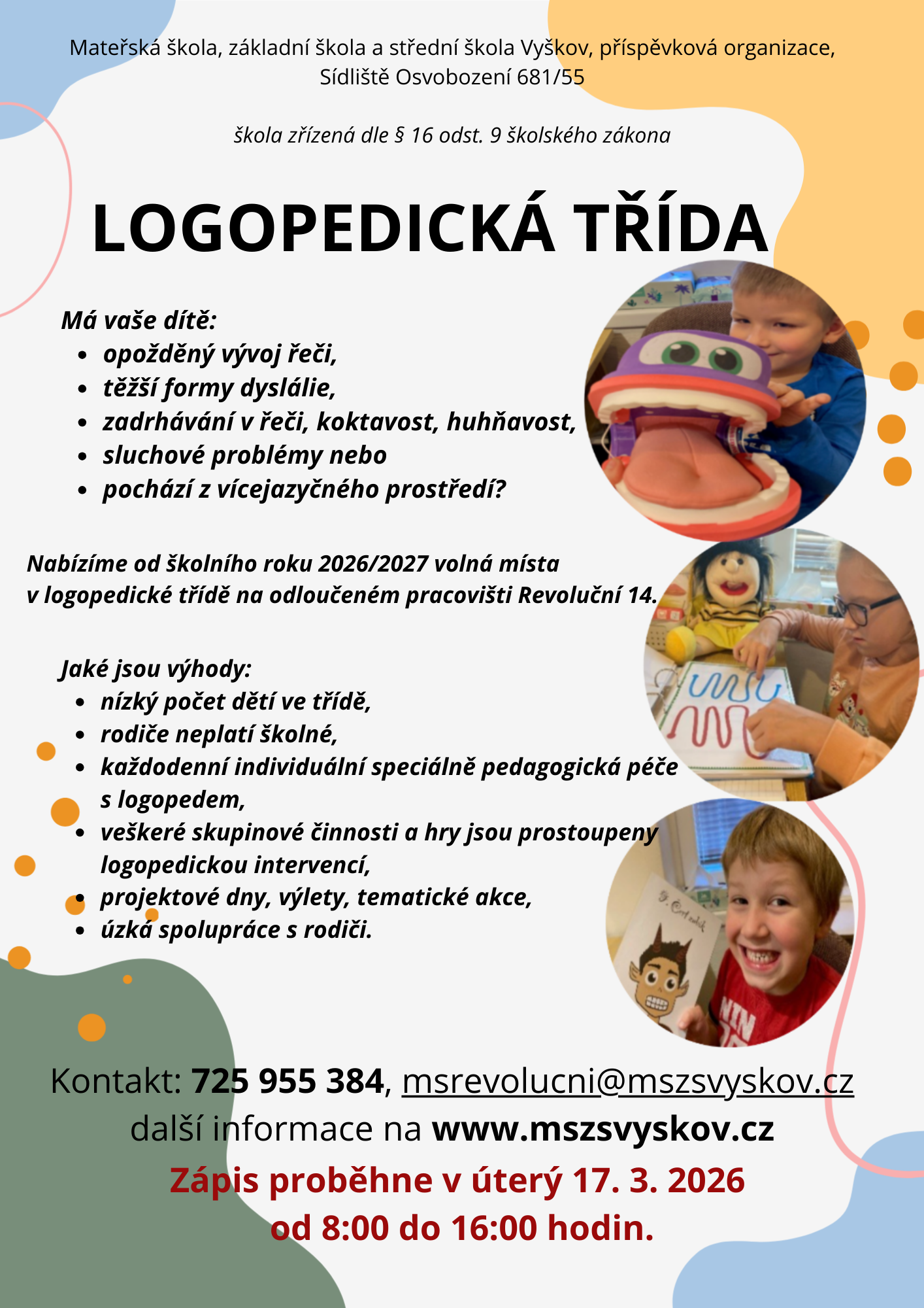 Zápis dětí do mateřské školy proběhne v úterý, 17. března 2026. Veškeré důležité informace si prosím prostudujte níže v příloze ve formátu PDF.
