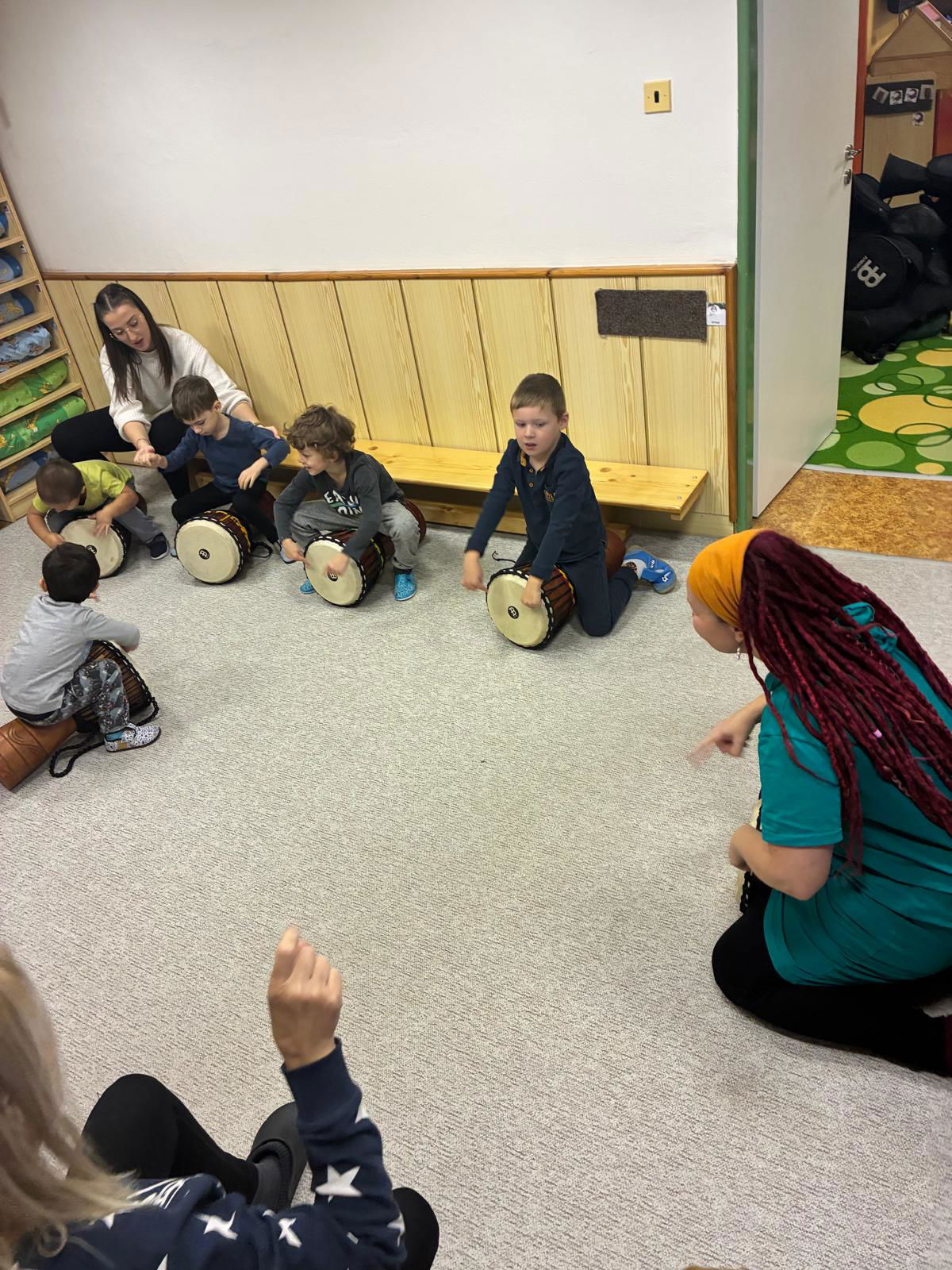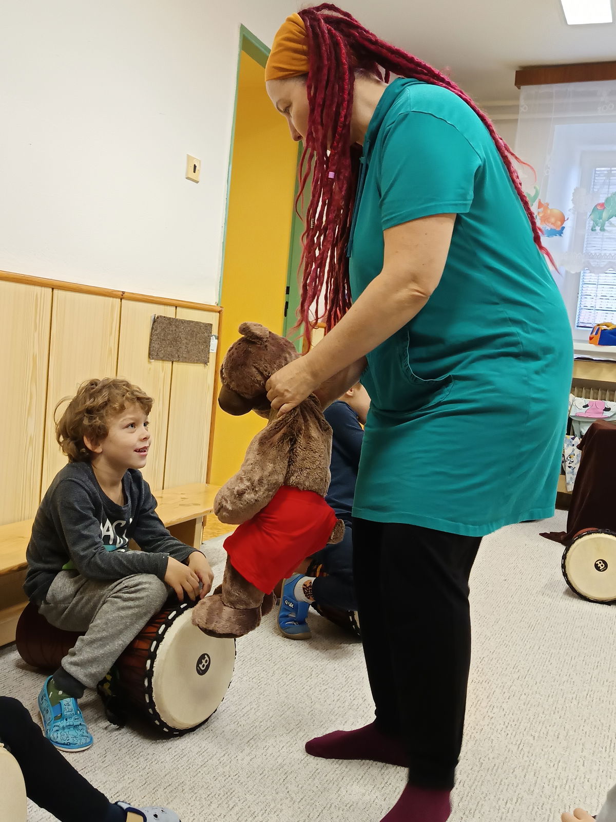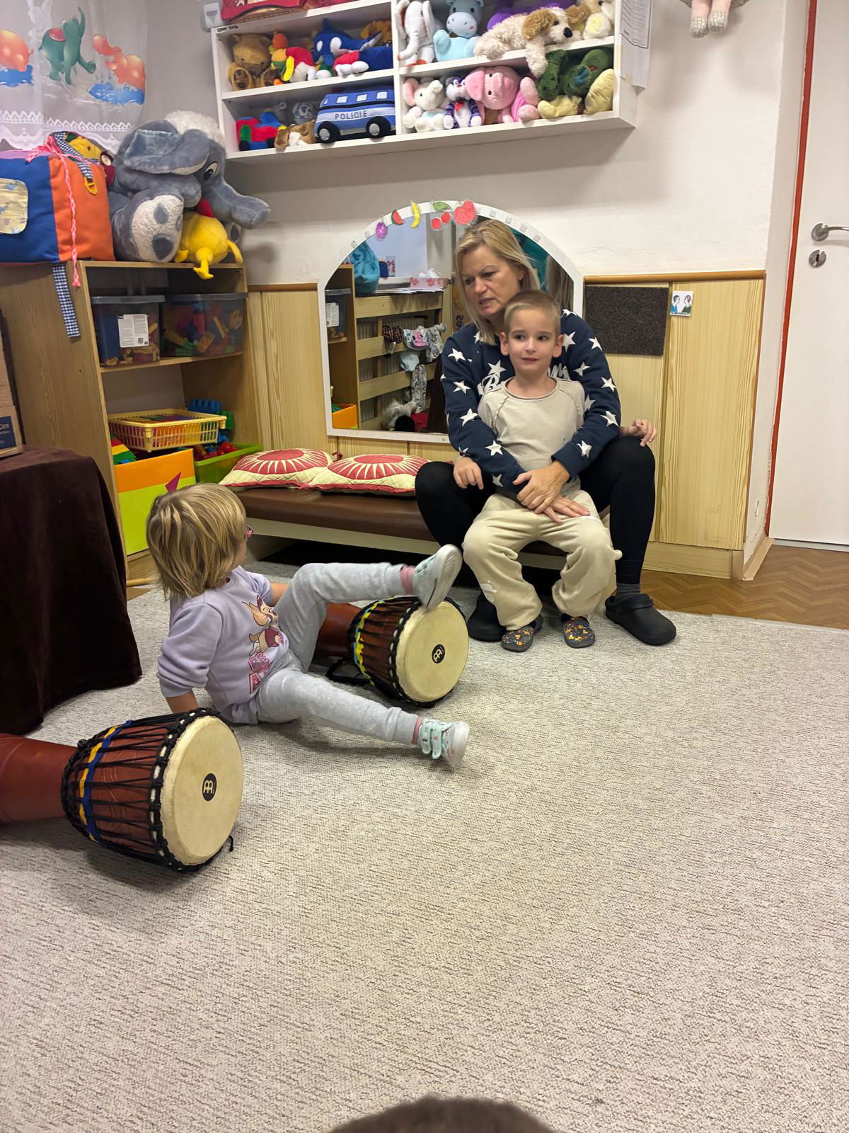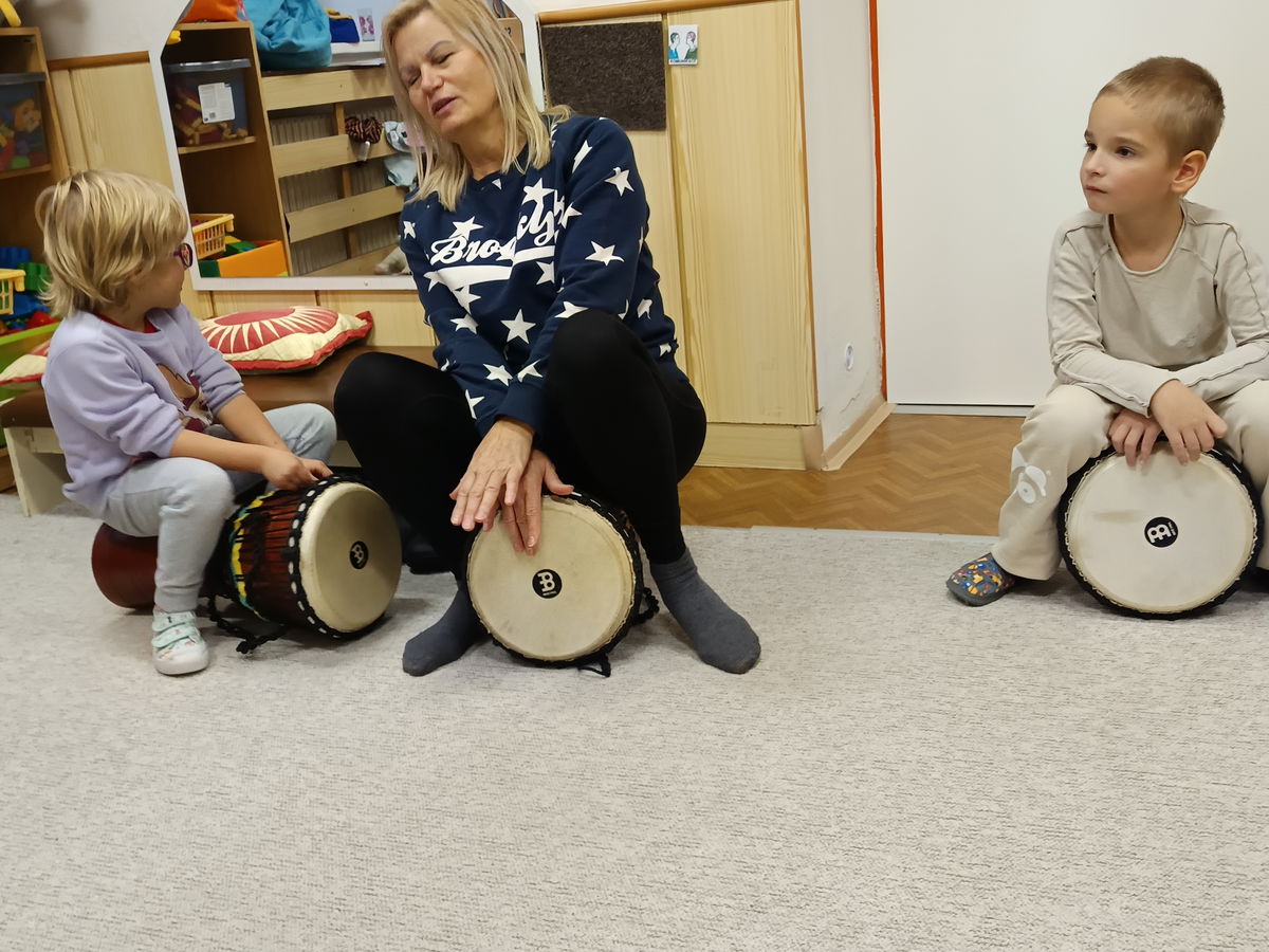 V pátek nás s dětmi čekala lekce hudby s bubny, kdy děti interaktivní formou prožívaly pohádkový příběh na motivy "Boudo, budko" a u toho bubnovaly podle pokynů paní lektorky. Každý měl svůj buben a mohl se vyjádřit podle svého.