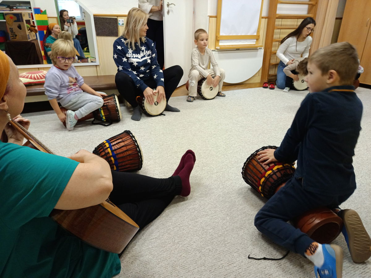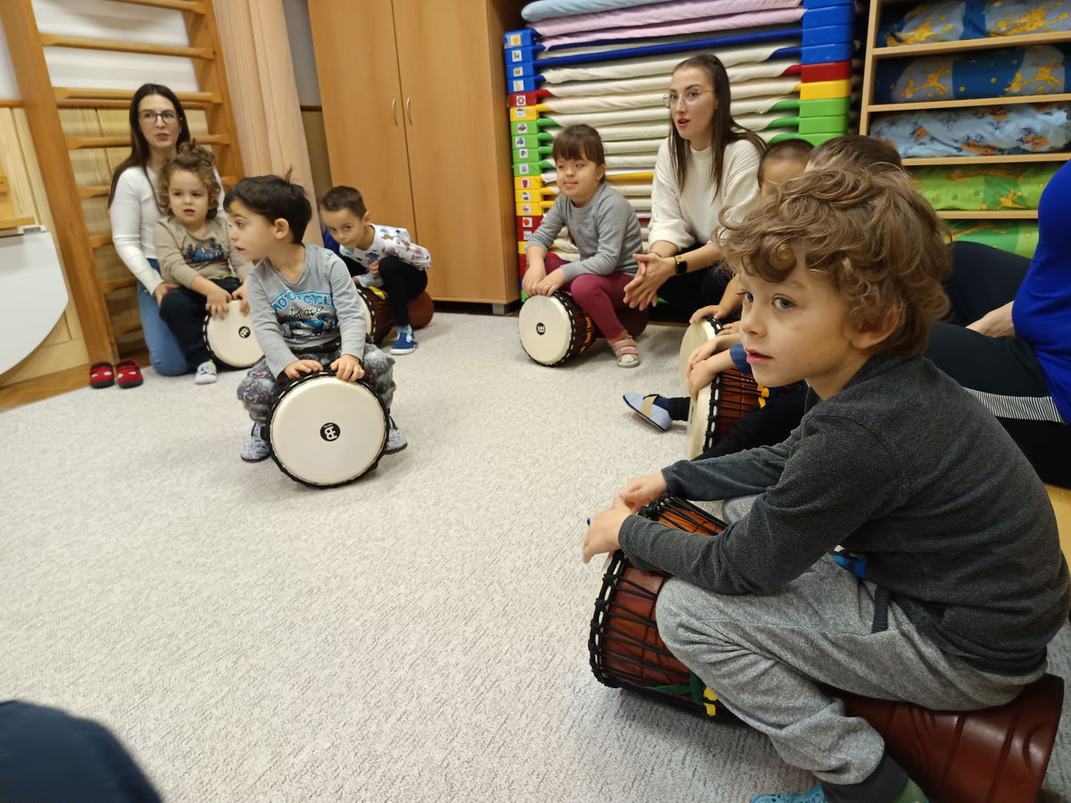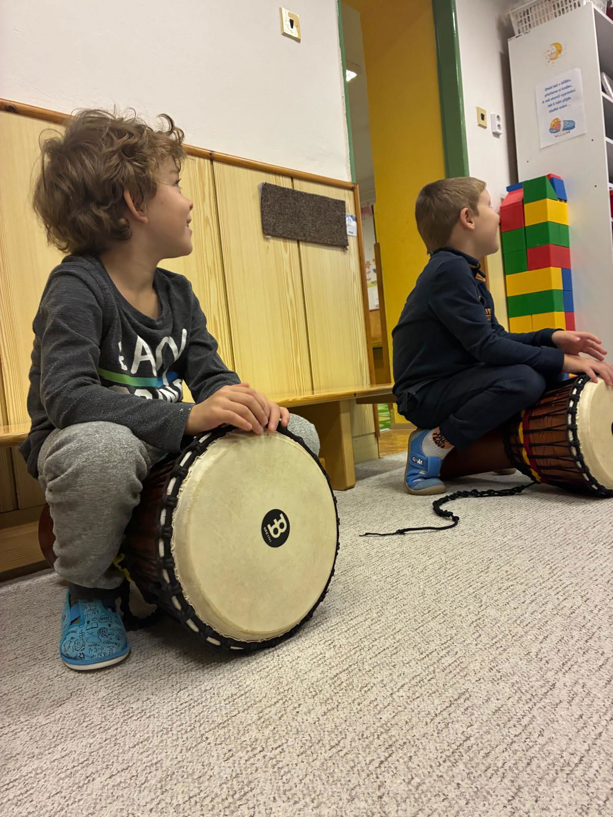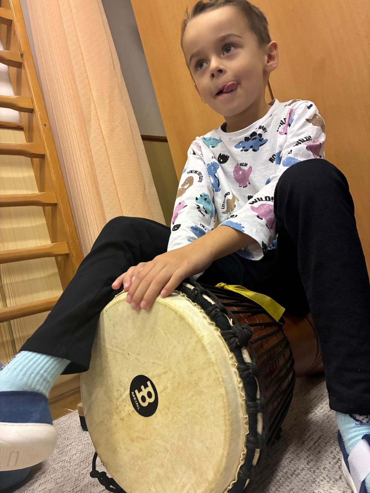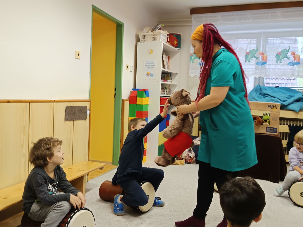 V pátek nás s dětmi čekala lekce hudby s bubny, kdy děti interaktivní formou prožívaly pohádkový příběh na motivy "Boudo, budko" a u toho bubnovaly podle pokynů paní lektorky. Každý měl svůj buben a mohl se vyjádřit podle svého.