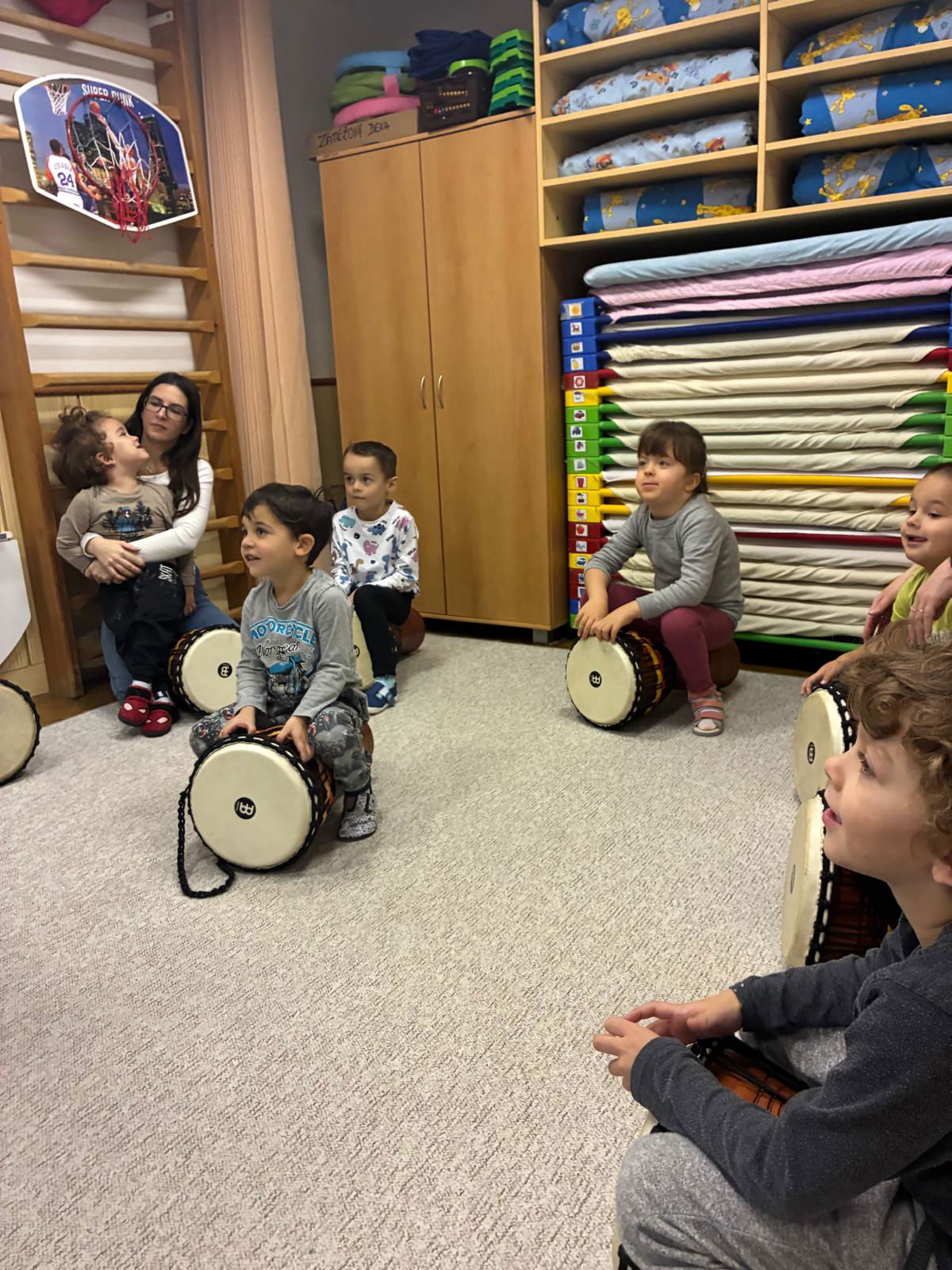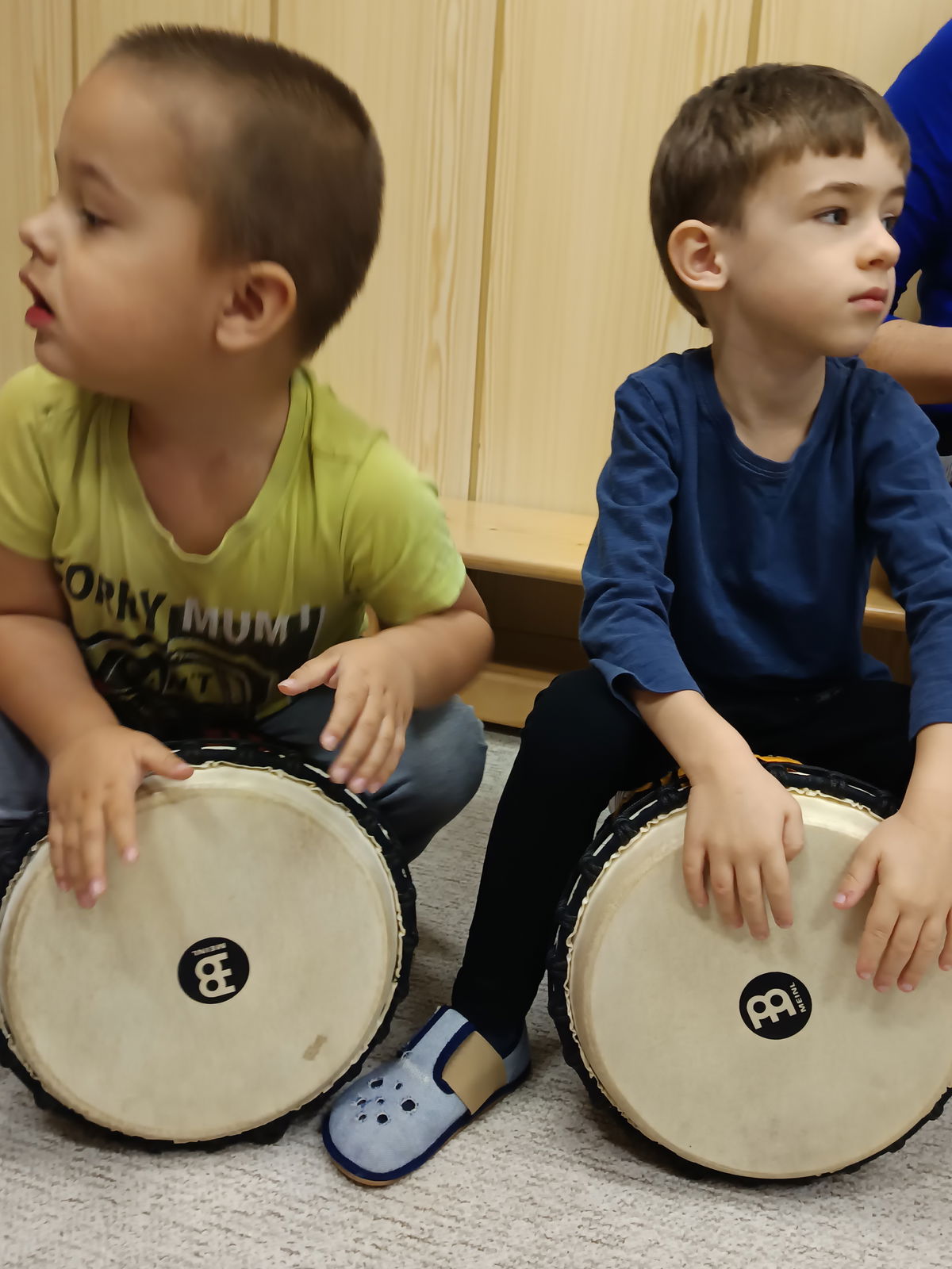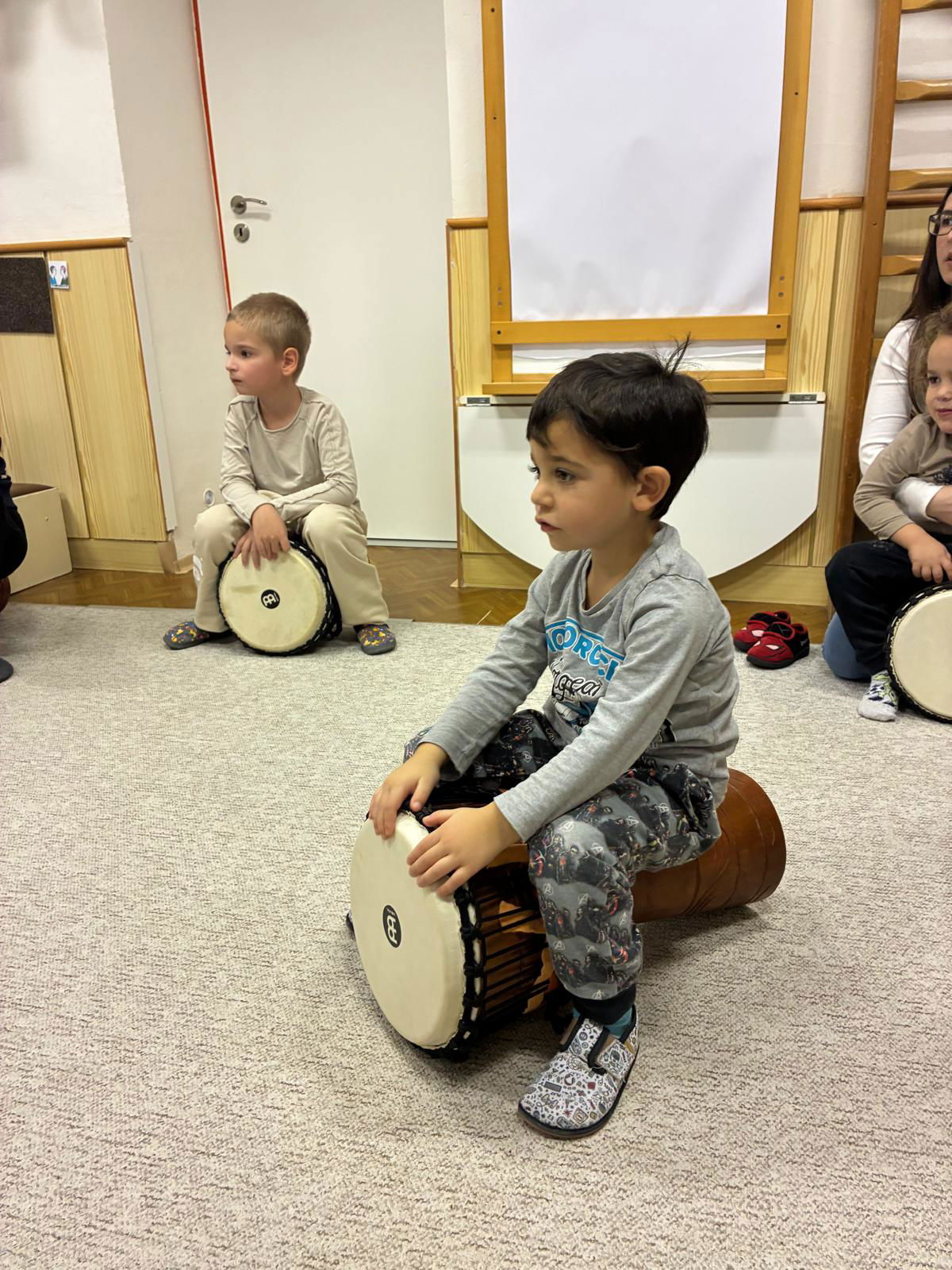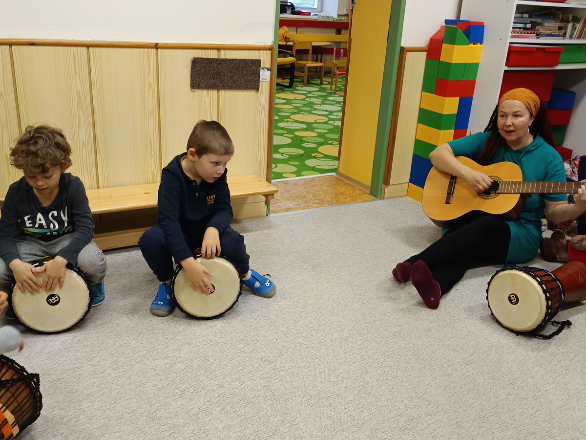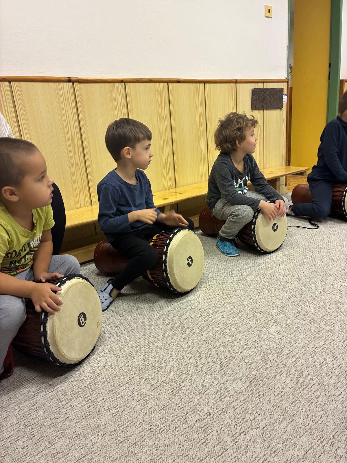 V pátek nás s dětmi čekala lekce hudby s bubny, kdy děti interaktivní formou prožívaly pohádkový příběh na motivy "Boudo, budko" a u toho bubnovaly podle pokynů paní lektorky. Každý měl svůj buben a mohl se vyjádřit podle svého.