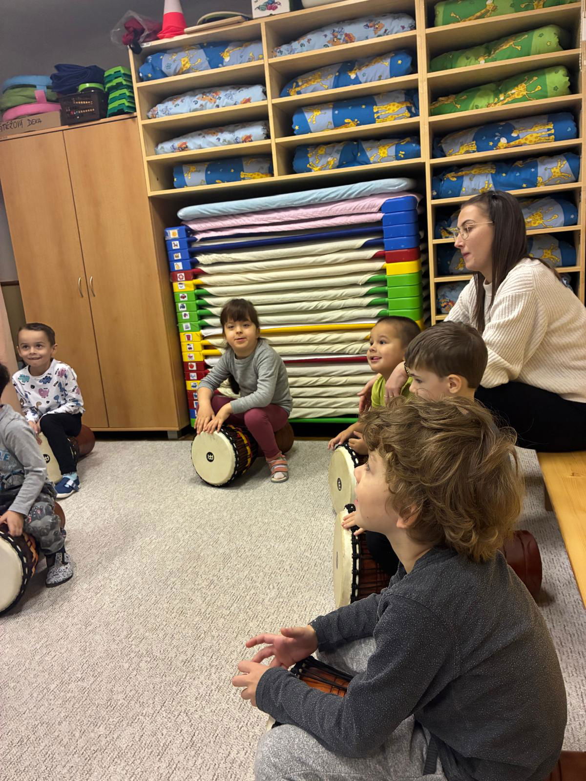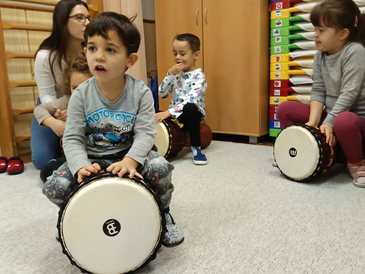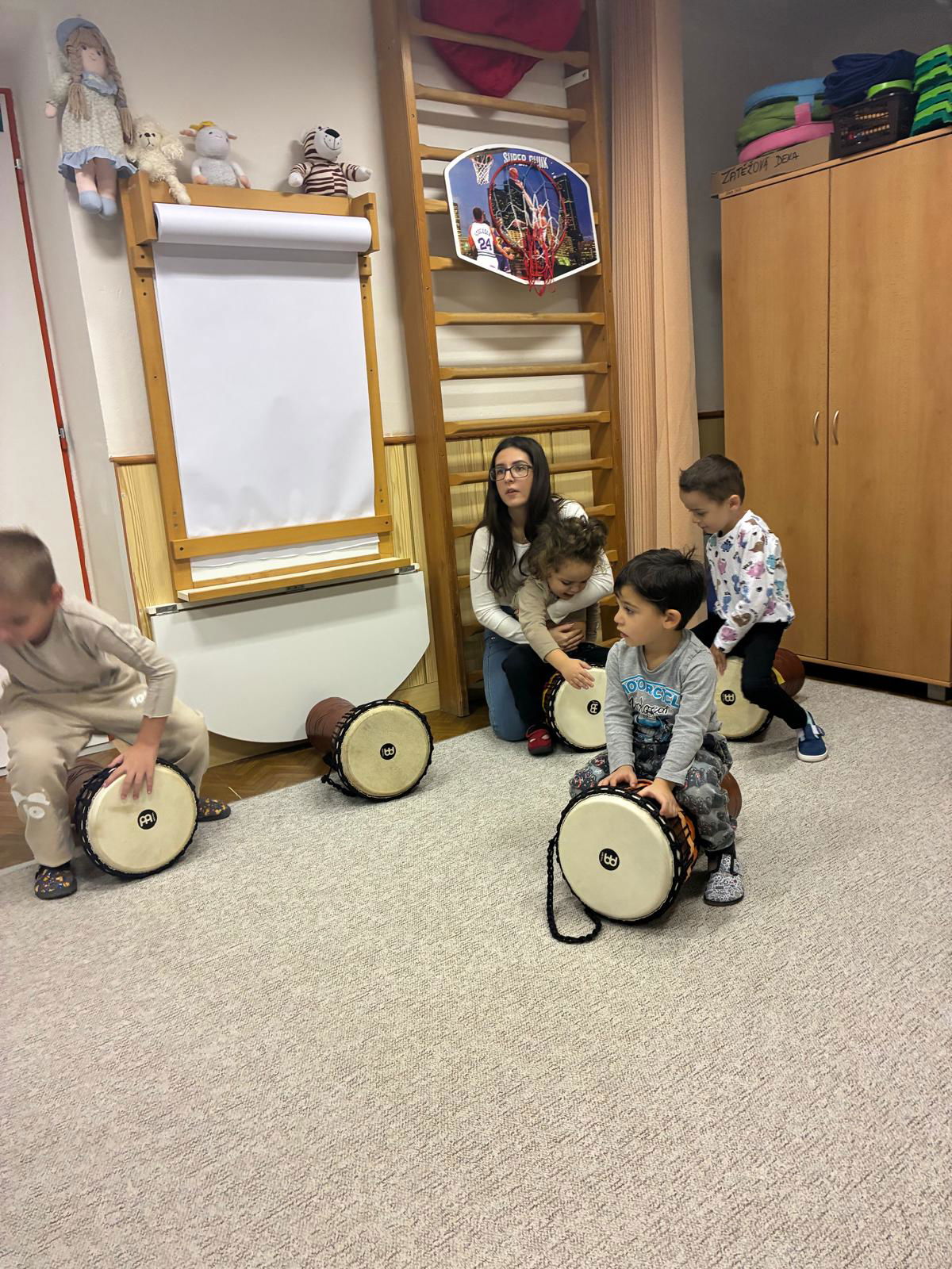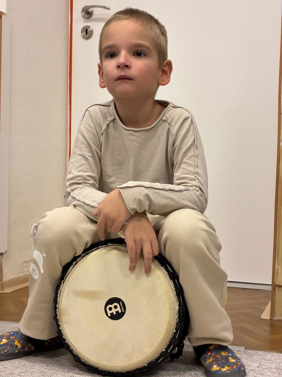 V pátek nás s dětmi čekala lekce hudby s bubny, kdy děti interaktivní formou prožívaly pohádkový příběh na motivy "Boudo, budko" a u toho bubnovaly podle pokynů paní lektorky. Každý měl svůj buben a mohl se vyjádřit podle svého.
