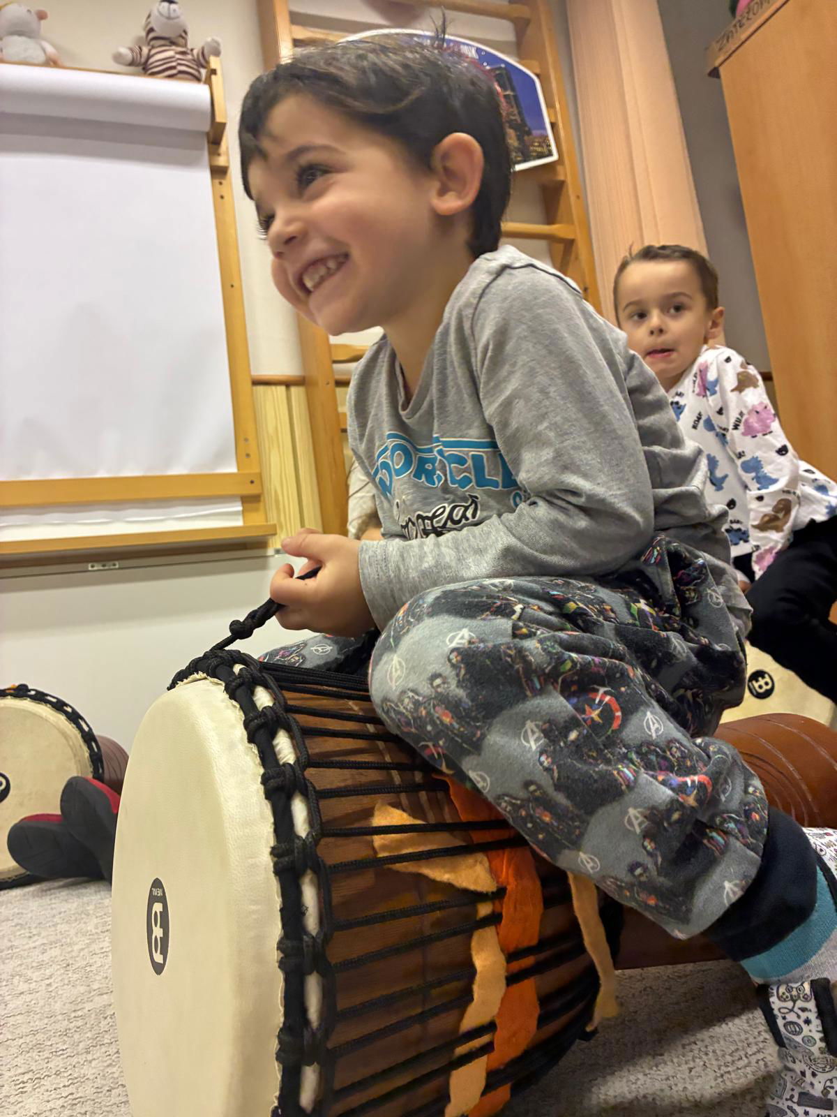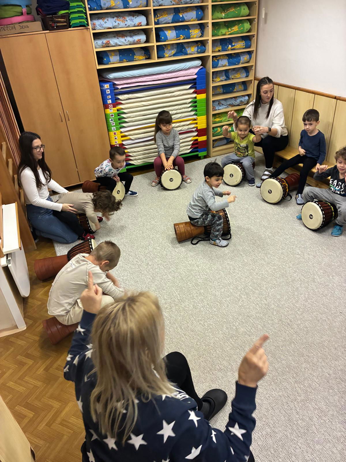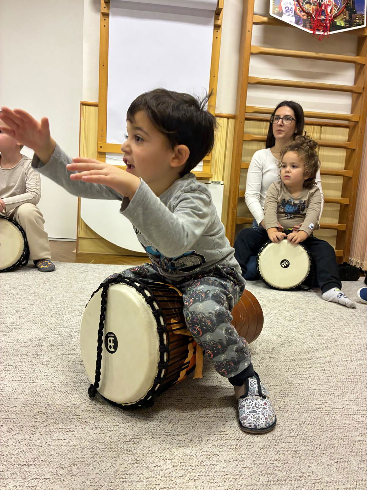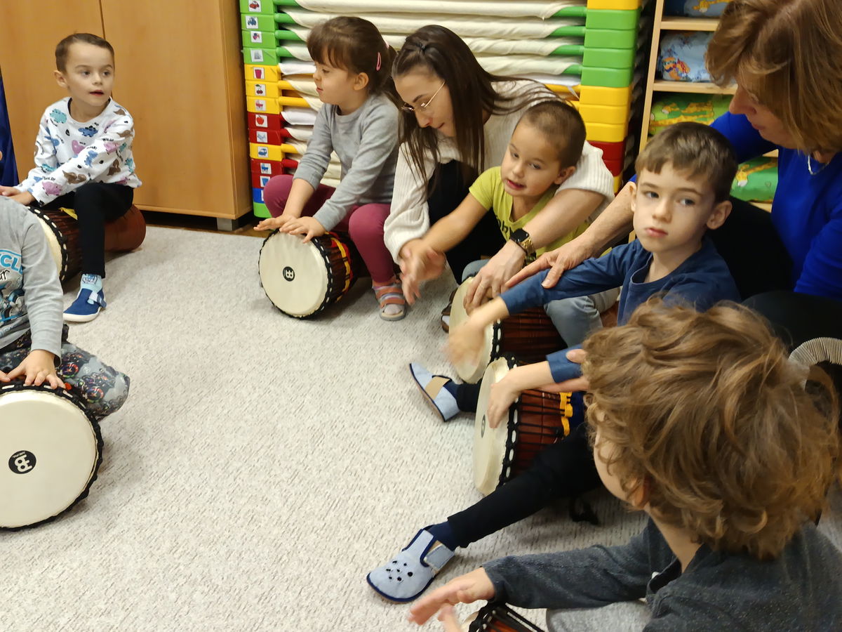 V pátek nás s dětmi čekala lekce hudby s bubny, kdy děti interaktivní formou prožívaly pohádkový příběh na motivy "Boudo, budko" a u toho bubnovaly podle pokynů paní lektorky. Každý měl svůj buben a mohl se vyjádřit podle svého.