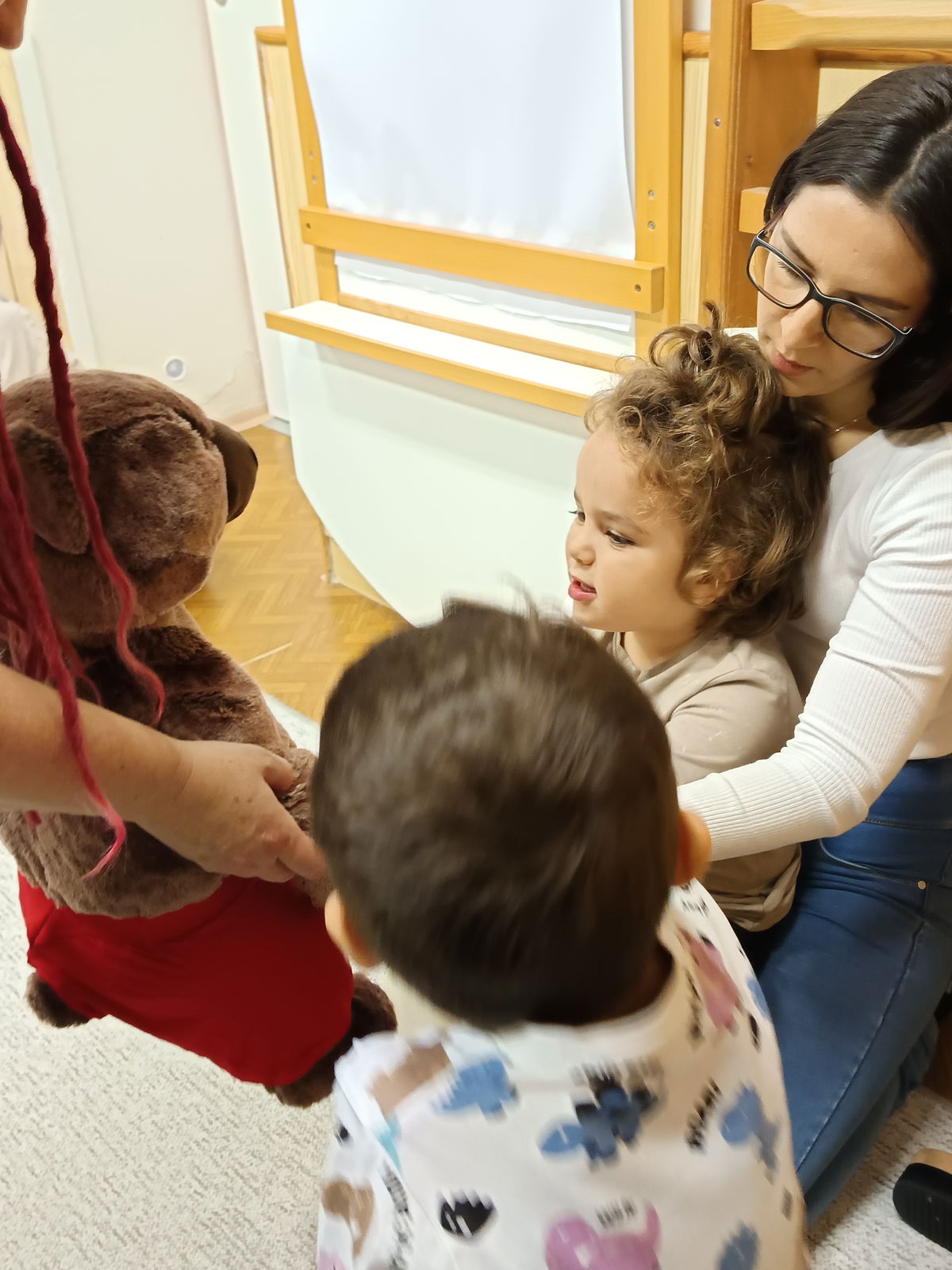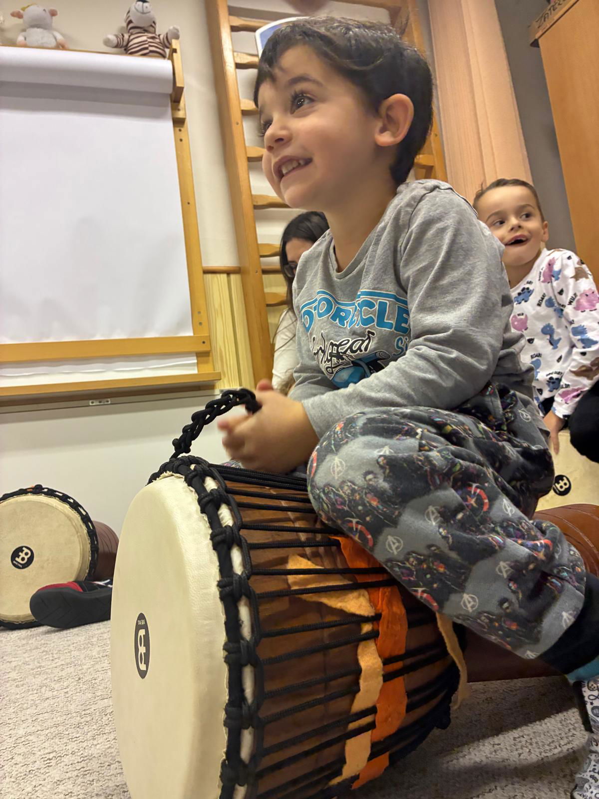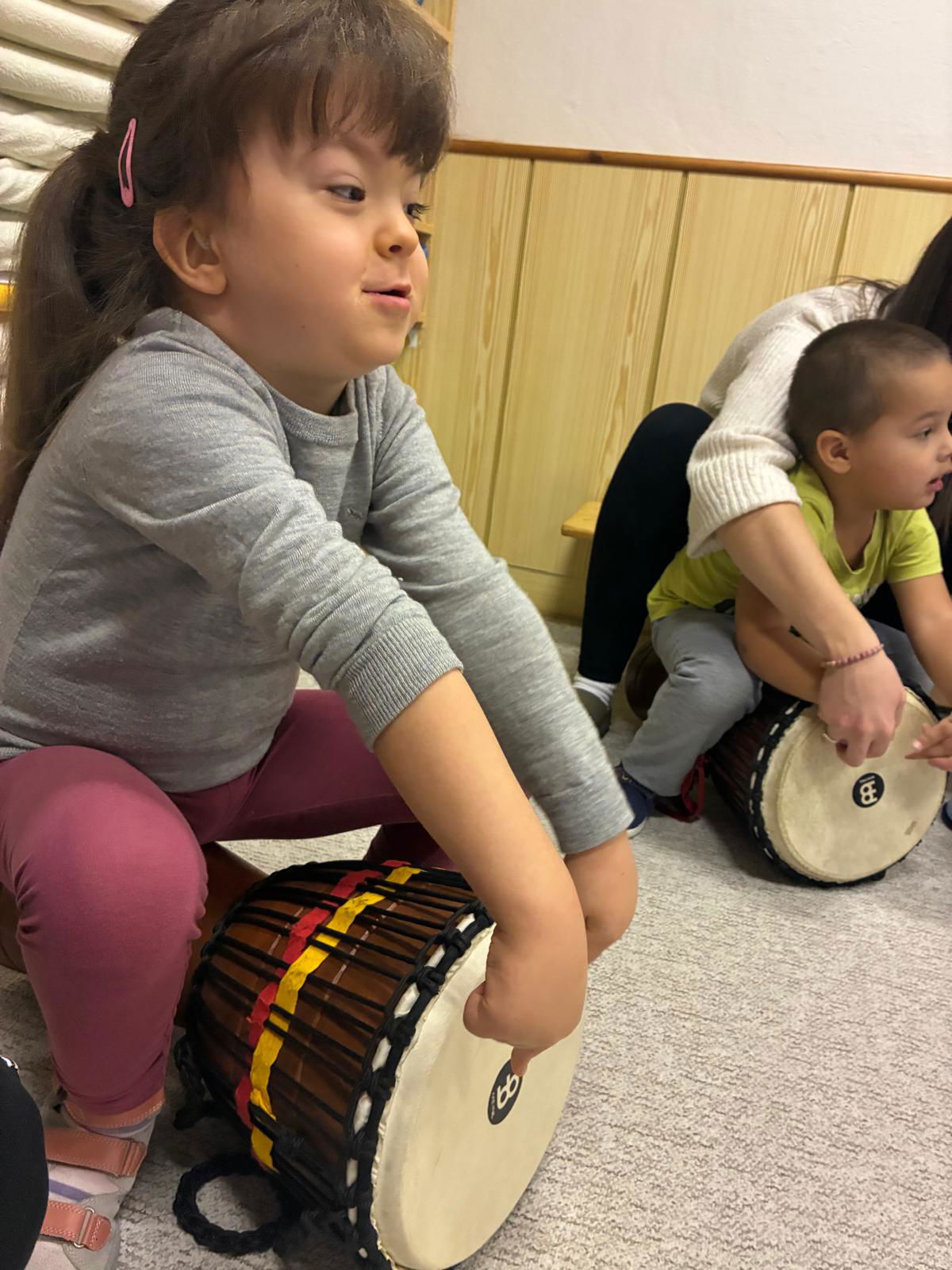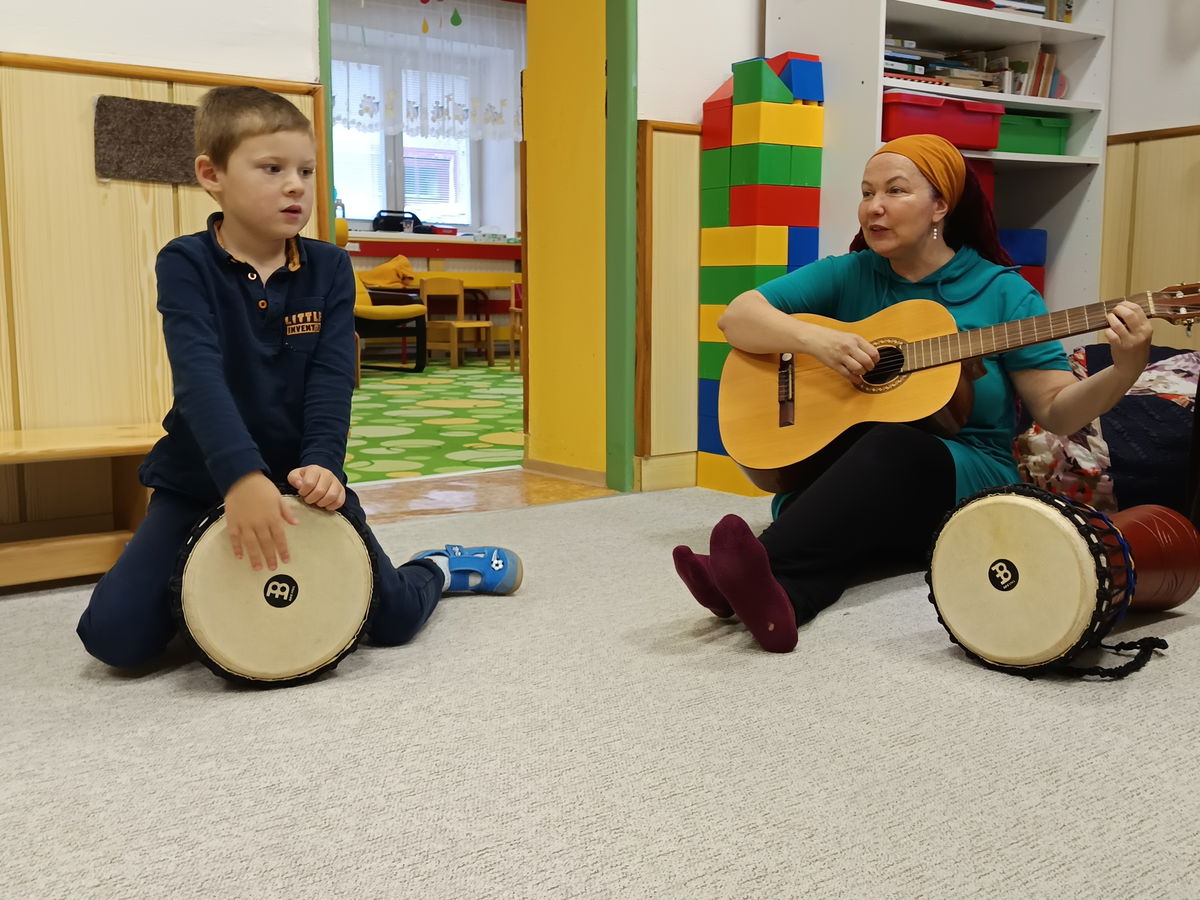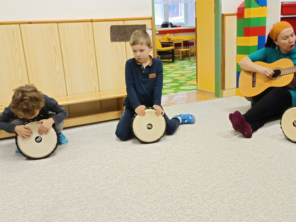 V pátek nás s dětmi čekala lekce hudby s bubny, kdy děti interaktivní formou prožívaly pohádkový příběh na motivy "Boudo, budko" a u toho bubnovaly podle pokynů paní lektorky. Každý měl svůj buben a mohl se vyjádřit podle svého.