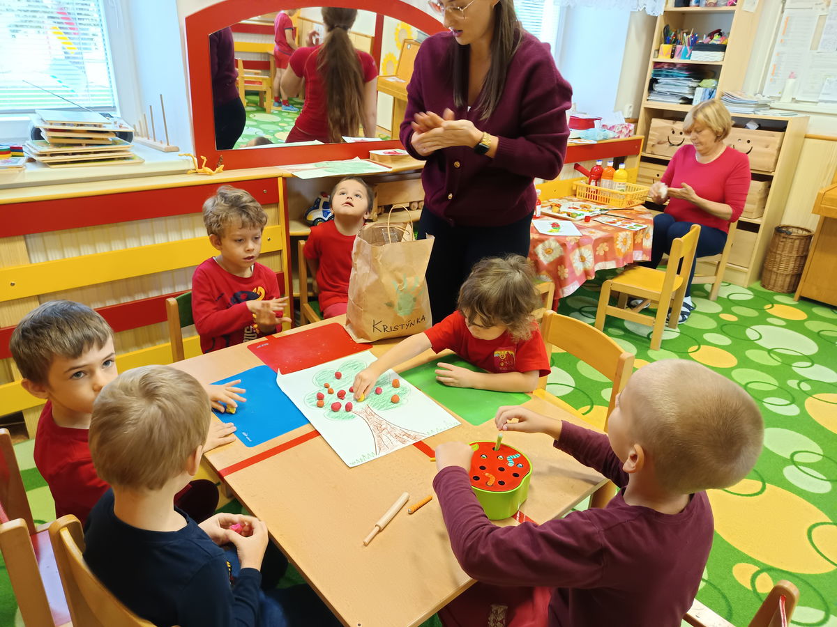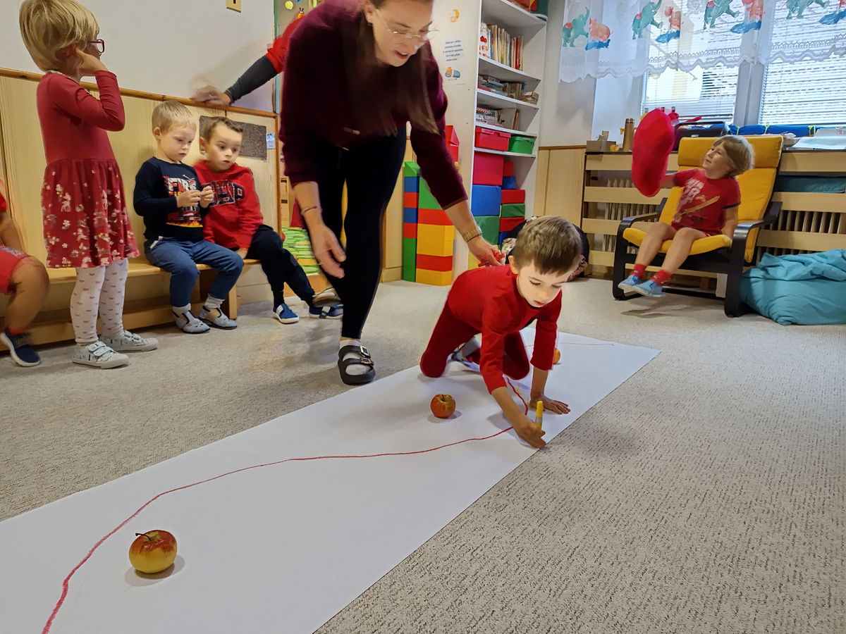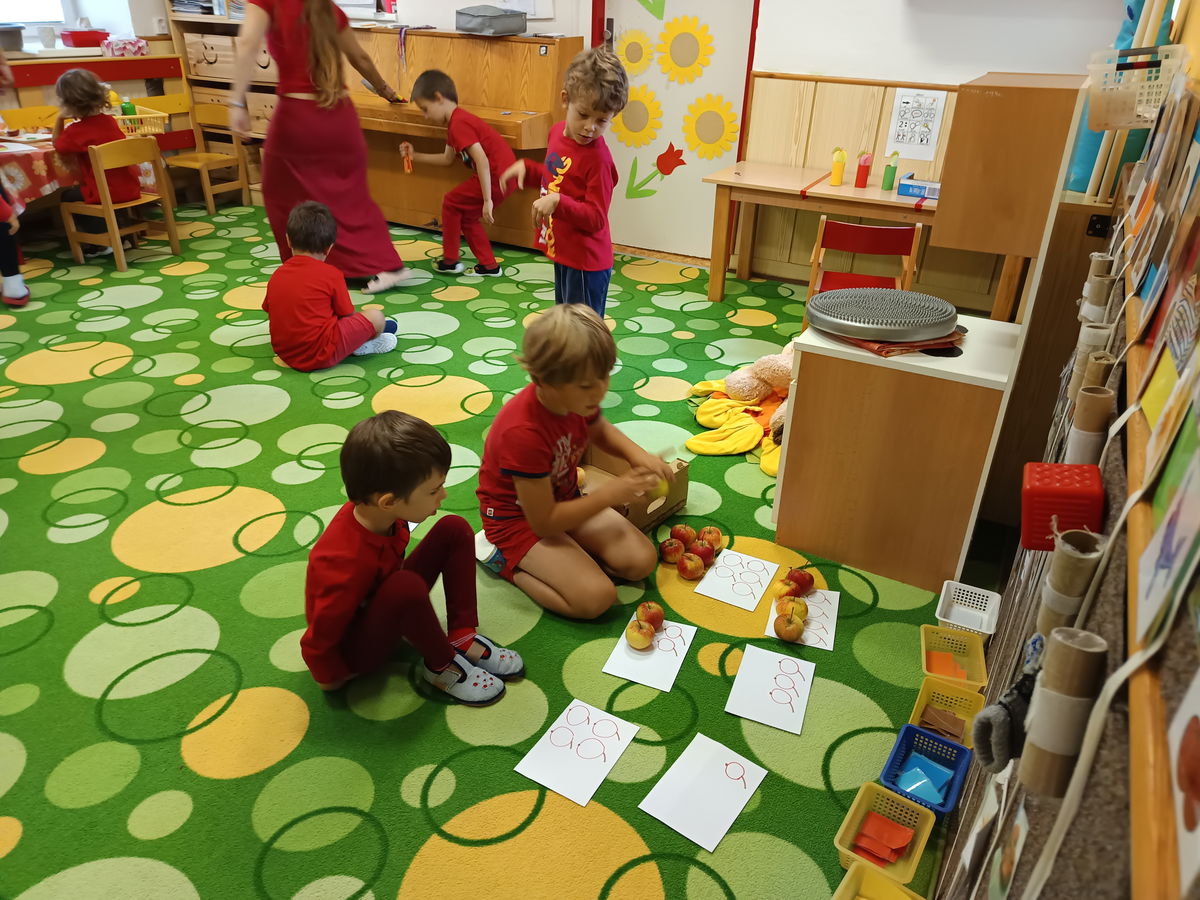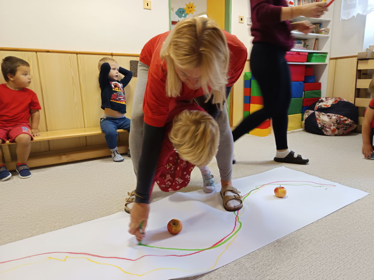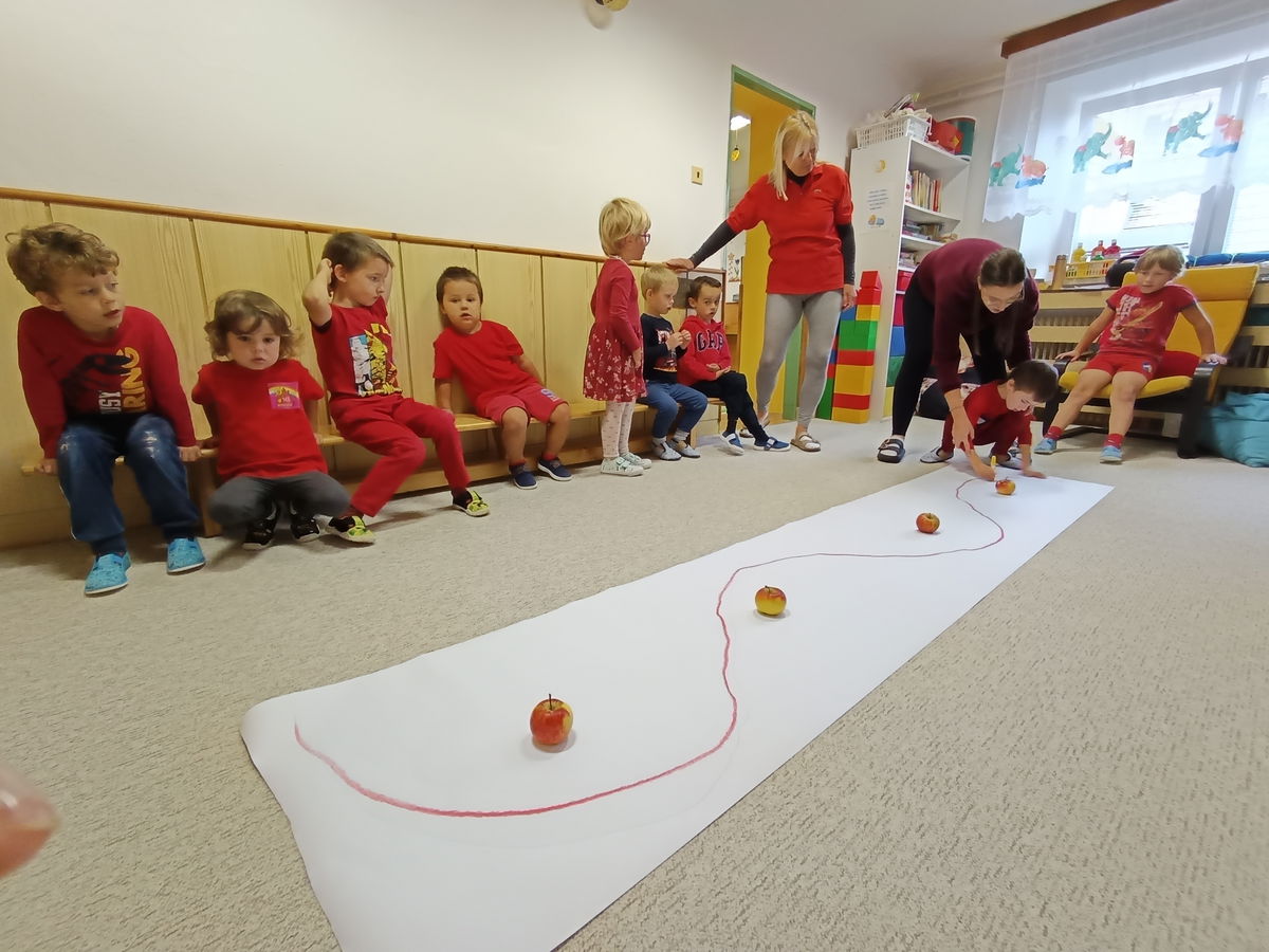 Ve středu 24. 9. 2025 proběhl ve školce červený jablíčkový, který jsme zahájili tanečkem na písničku "Měla babka". Děti také přemisťovaly jablíčka ze stromu do košíku a válely u toho sudy, zdolávaly překážkovou dráhu. Čekala je také výtvarná aktivita, kdy otiskovaly jablíčka na šablonu, nebo barvily jablíčko prsty. Třídily také jablíčka dle barev, velikostí a další. Dětem se aktivity líbily a s chutí se do všeho zapojily.