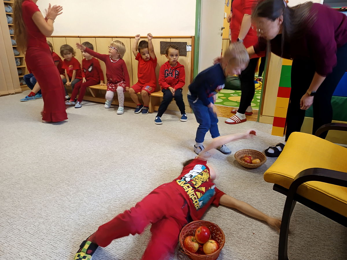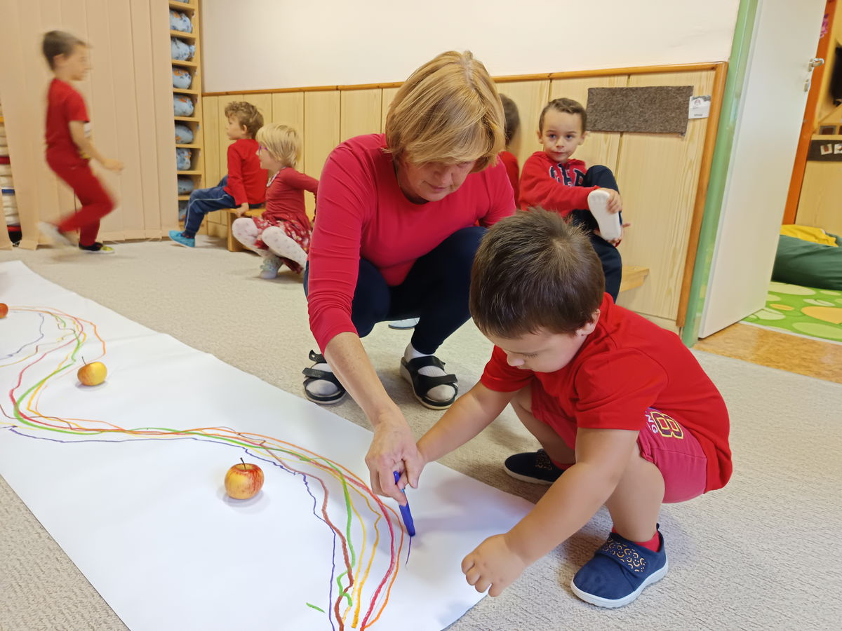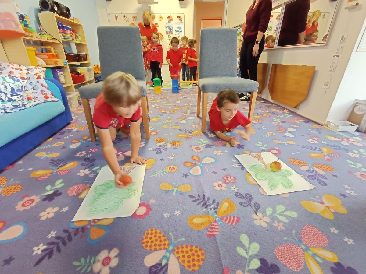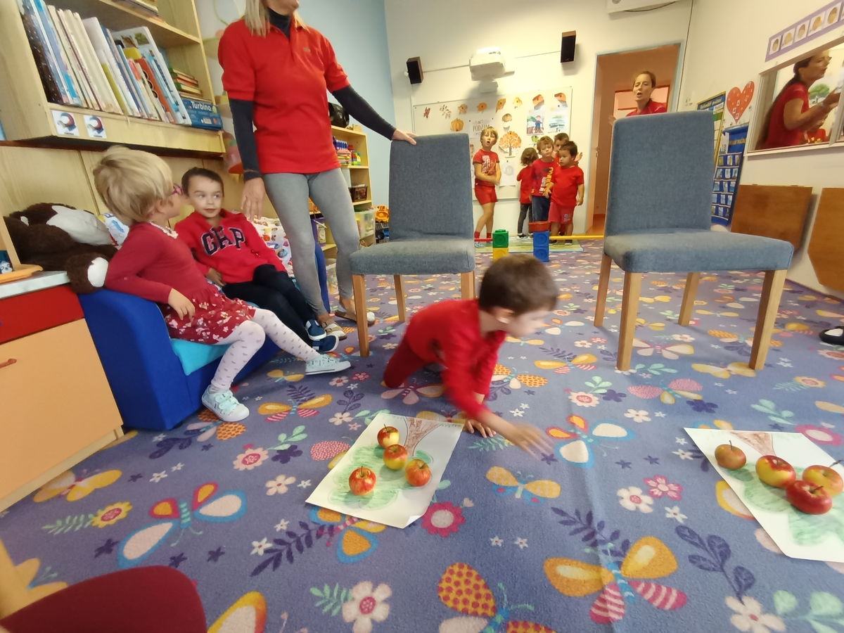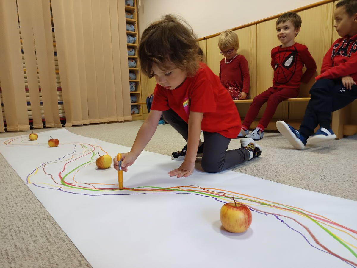 Ve středu 24. 9. 2025 proběhl ve školce červený jablíčkový, který jsme zahájili tanečkem na písničku "Měla babka". Děti také přemisťovaly jablíčka ze stromu do košíku a válely u toho sudy, zdolávaly překážkovou dráhu. Čekala je také výtvarná aktivita, kdy otiskovaly jablíčka na šablonu, nebo barvily jablíčko prsty. Třídily také jablíčka dle barev, velikostí a další. Dětem se aktivity líbily a s chutí se do všeho zapojily.