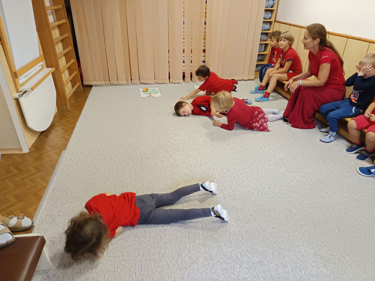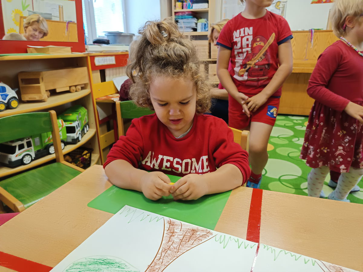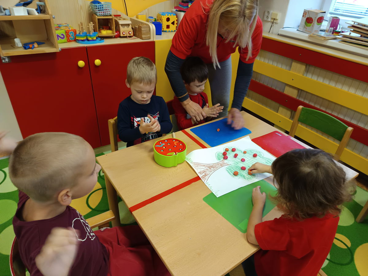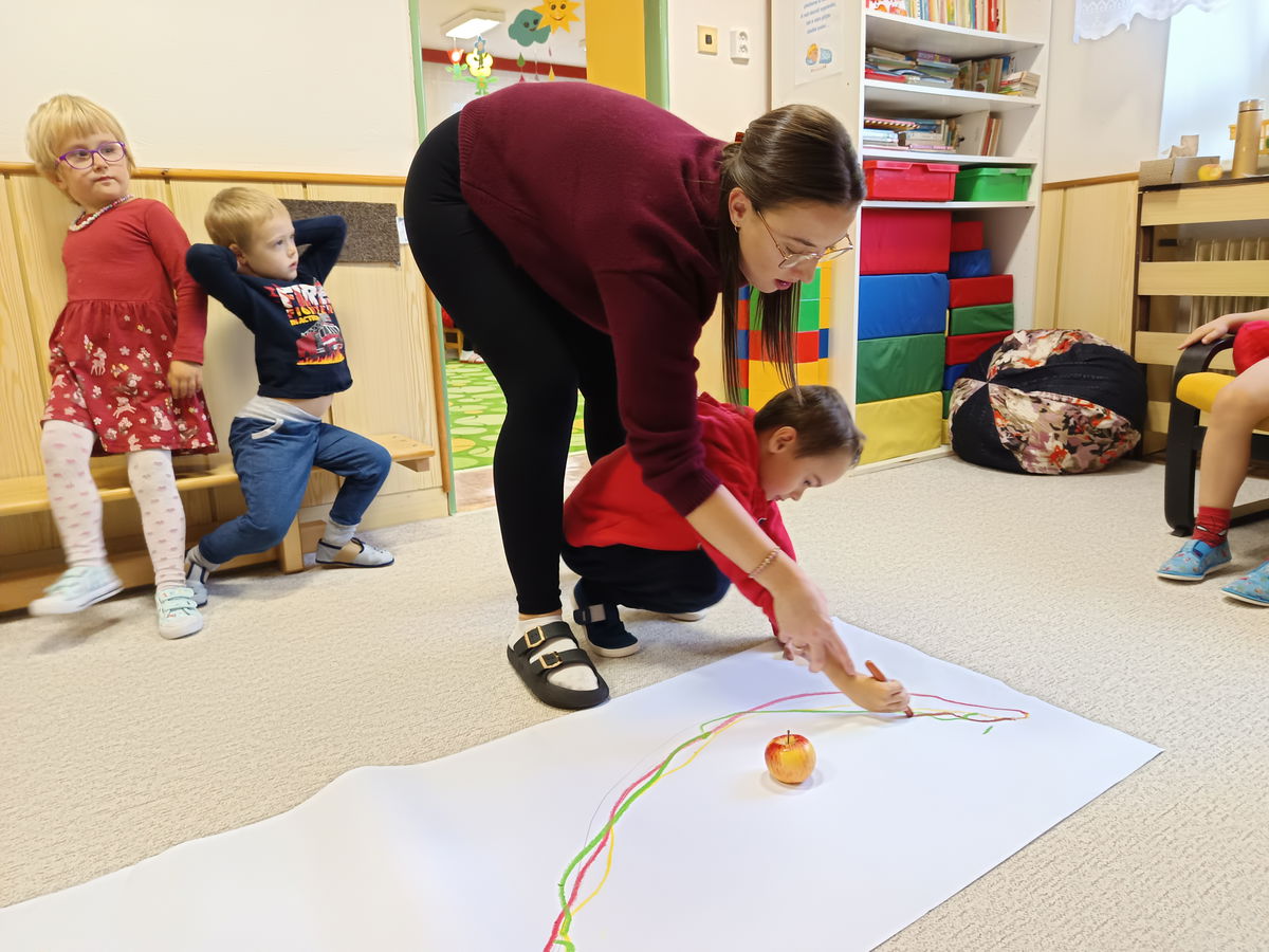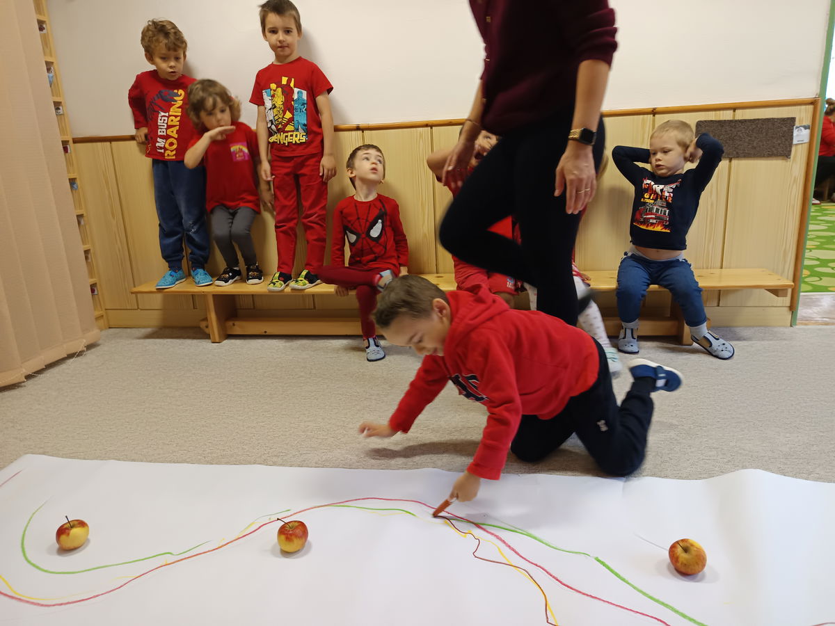 Ve středu 24. 9. 2025 proběhl ve školce červený jablíčkový, který jsme zahájili tanečkem na písničku "Měla babka". Děti také přemisťovaly jablíčka ze stromu do košíku a válely u toho sudy, zdolávaly překážkovou dráhu. Čekala je také výtvarná aktivita, kdy otiskovaly jablíčka na šablonu, nebo barvily jablíčko prsty. Třídily také jablíčka dle barev, velikostí a další. Dětem se aktivity líbily a s chutí se do všeho zapojily.