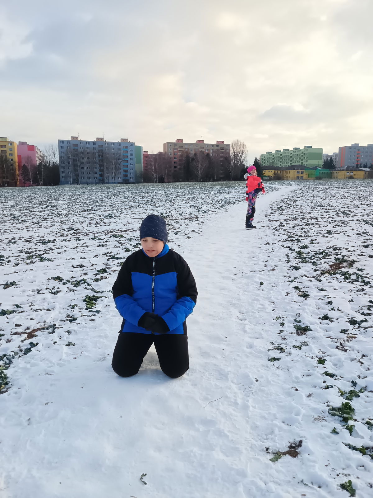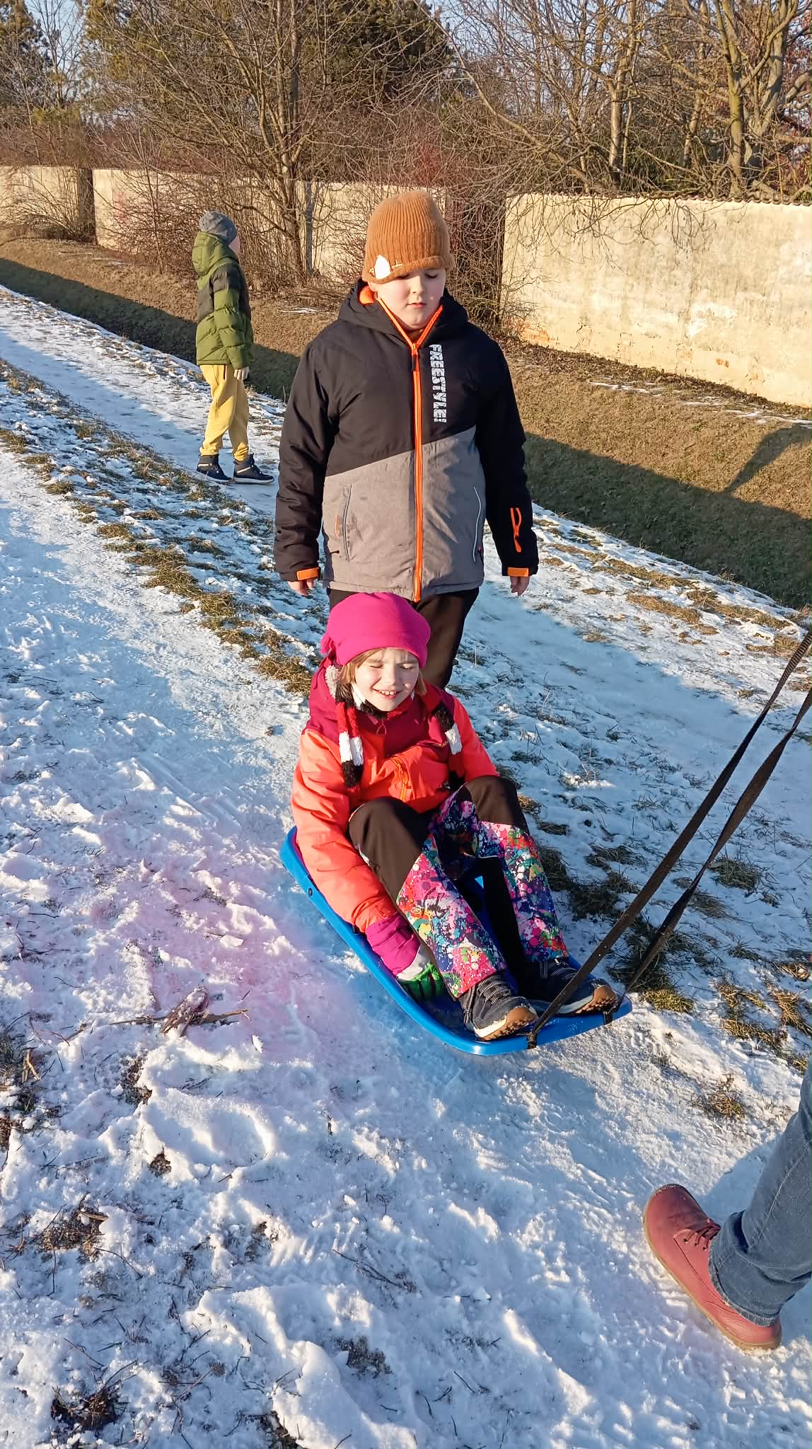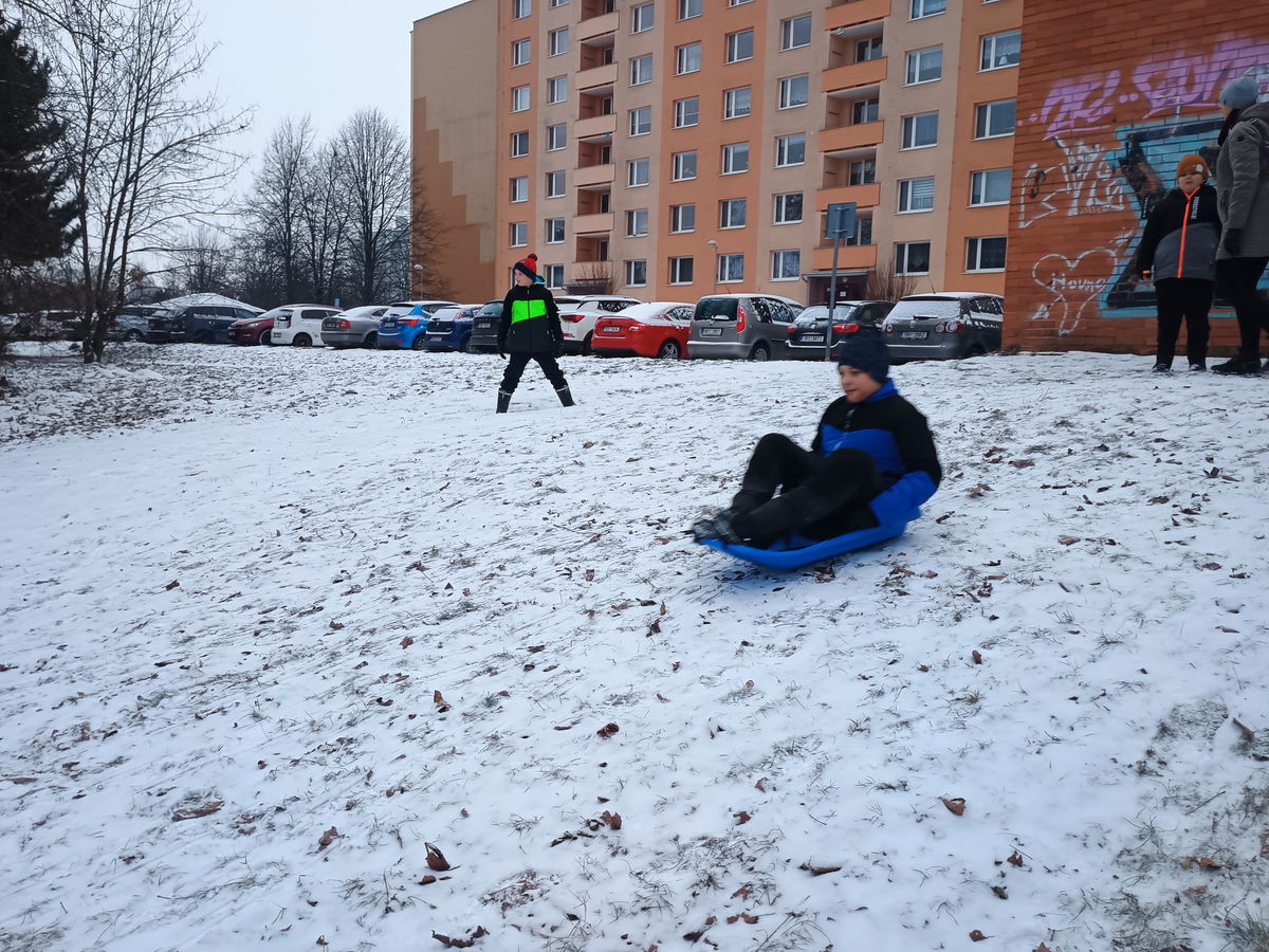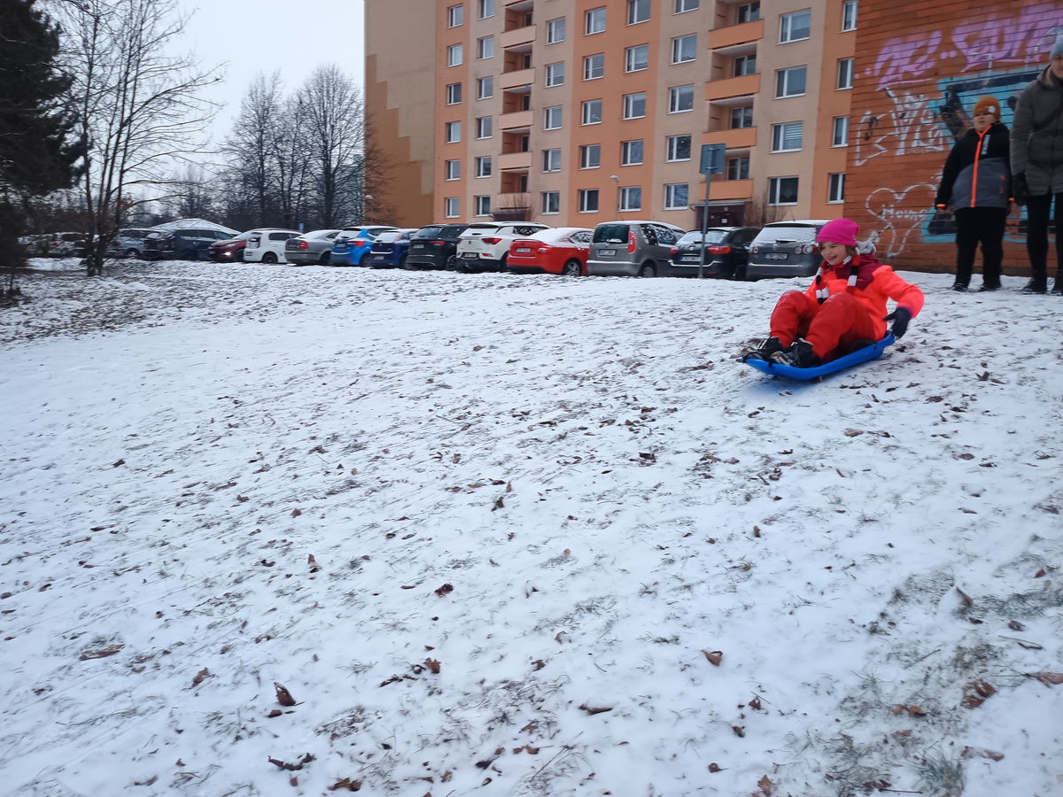 V lednu jsme využili toho, že trochu nasněžilo a svezli jsme se na bobech a pohráli si ve sněhu. Vyzkoušeli jsme různá místa a různé kopečky. Děti si to náramně užily.