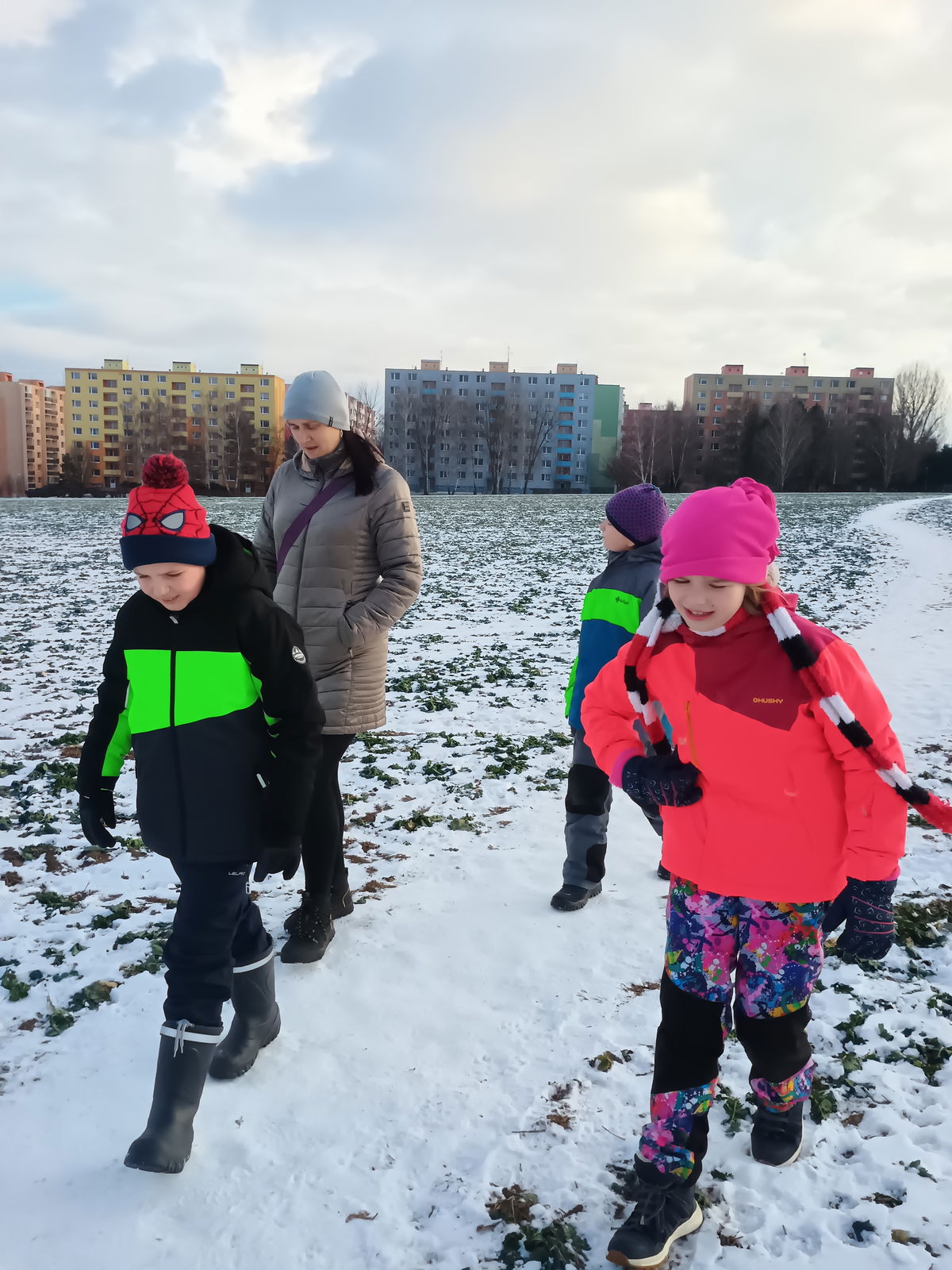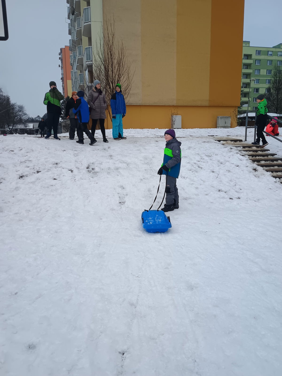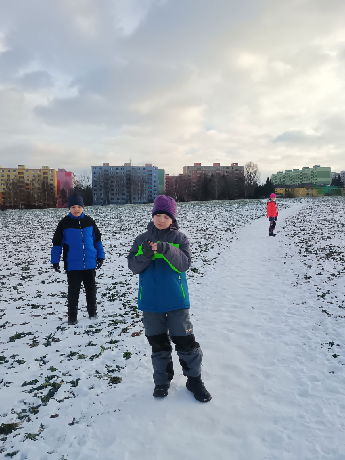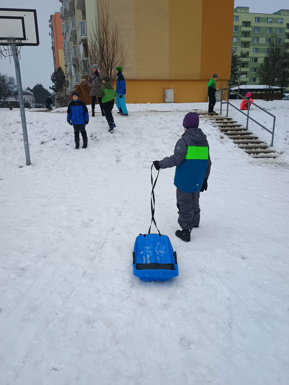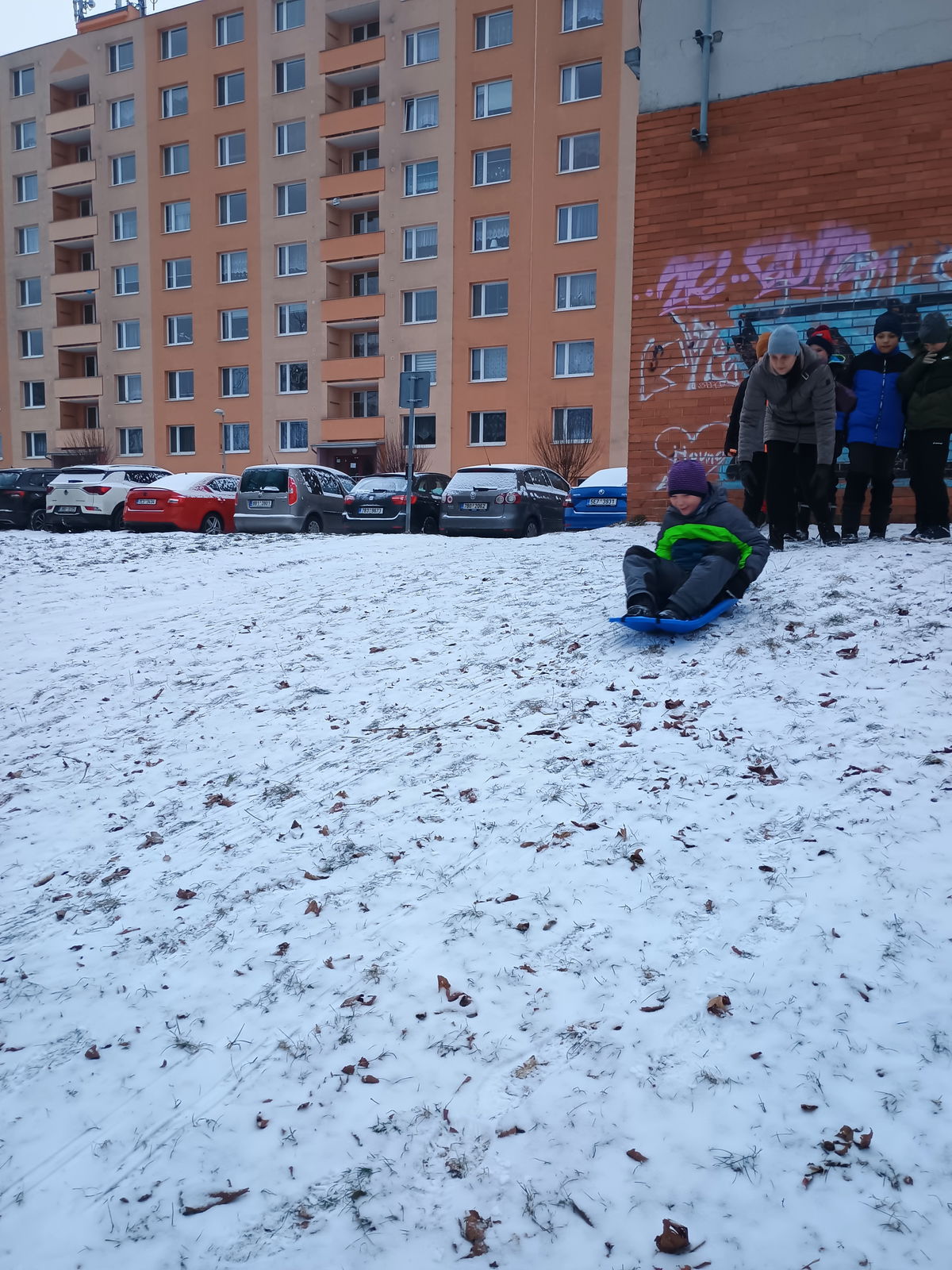 V lednu jsme využili toho, že trochu nasněžilo a svezli jsme se na bobech a pohráli si ve sněhu. Vyzkoušeli jsme různá místa a různé kopečky. Děti si to náramně užily.