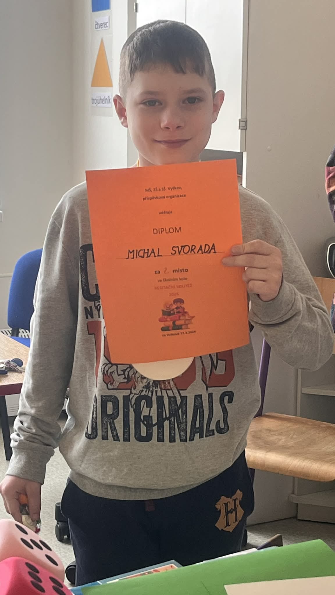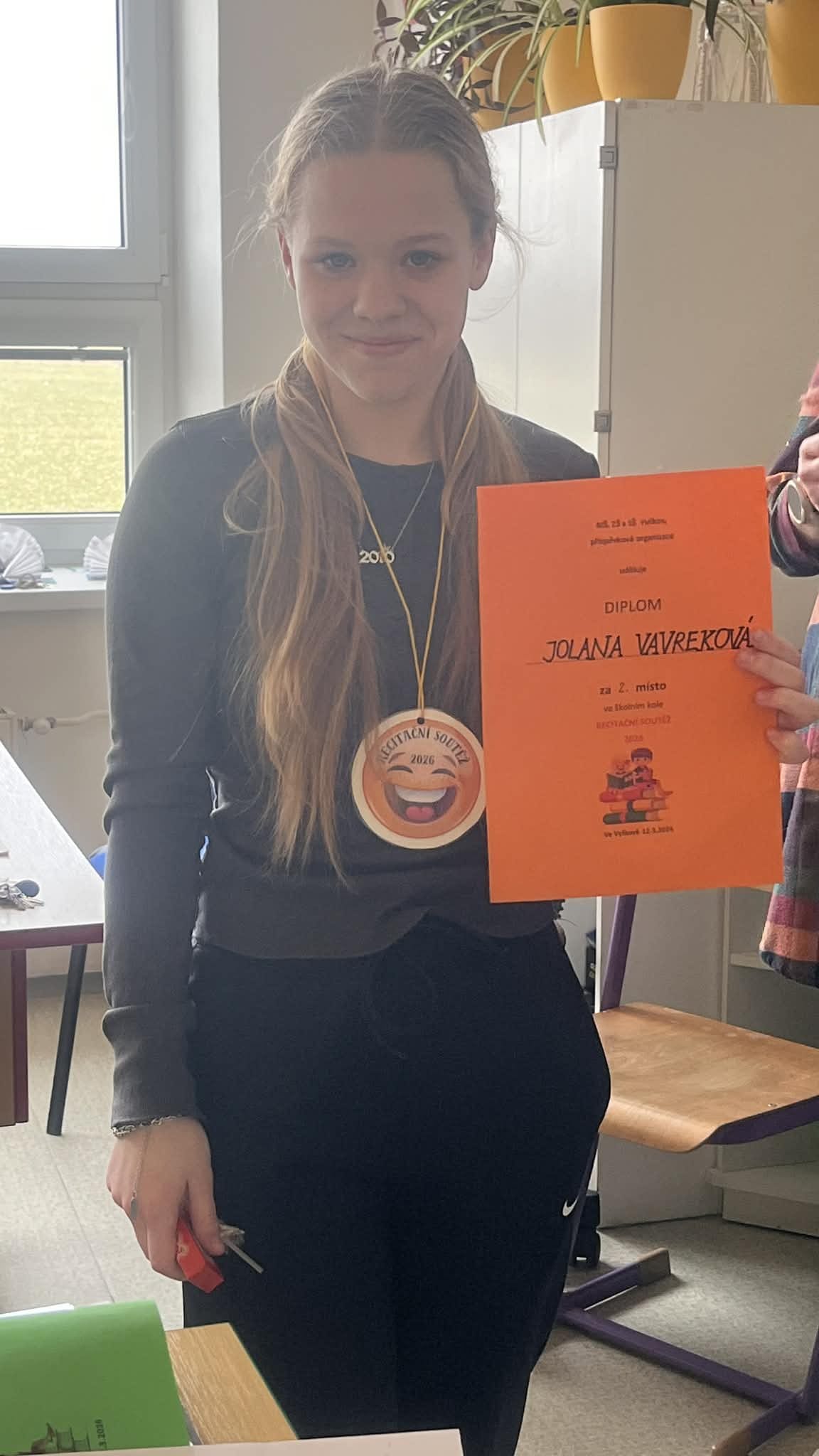 Dne 12.3.2026 se naší škole konalo školní kolo recitační soutěže. Žáci ze ZŠ soutěžili ve čtyřech kategoriích. Recitační soutěže se zúčastnilo celkem 15 žáků. Výsledky  všech kategorií jsou následující.