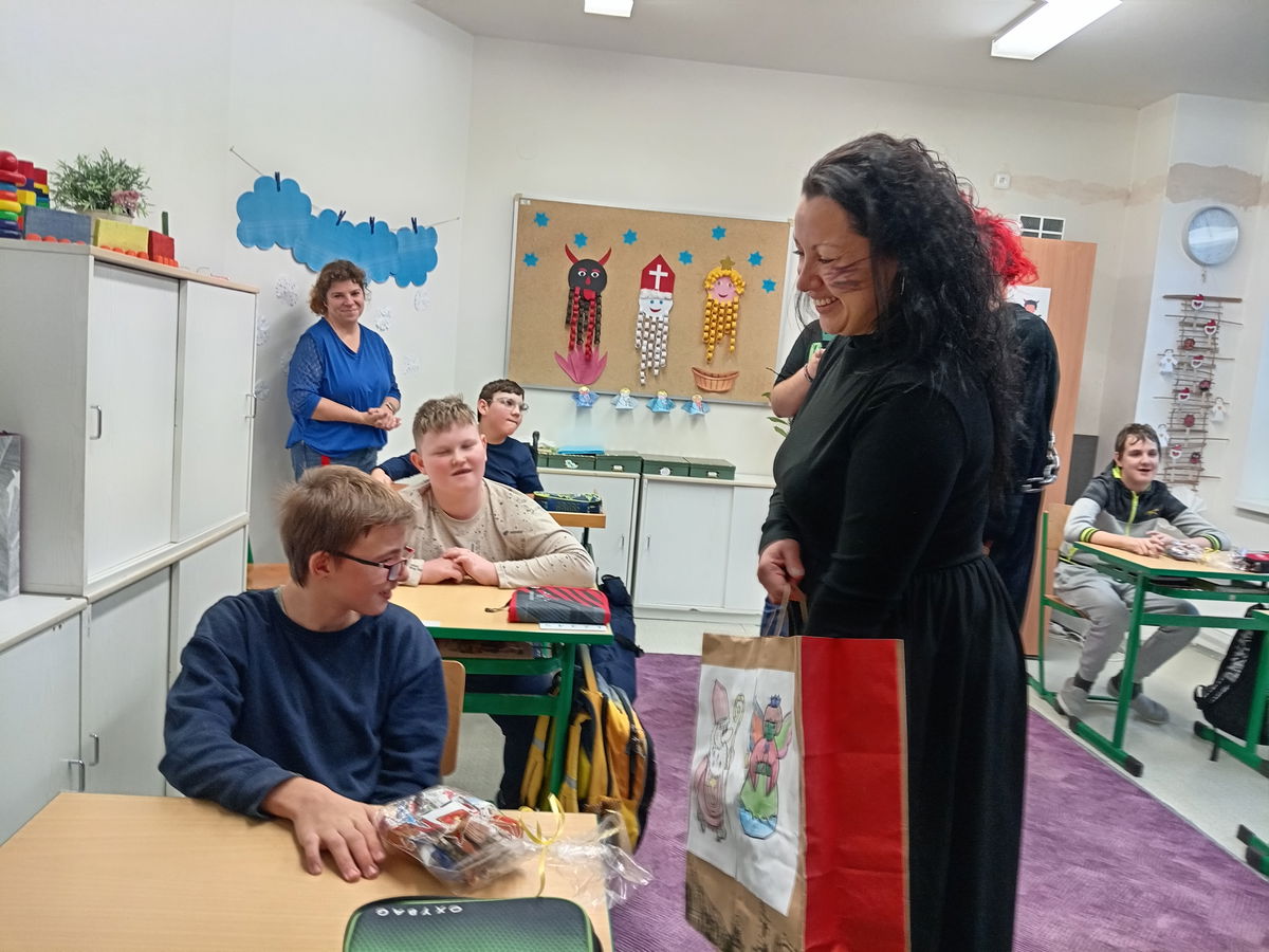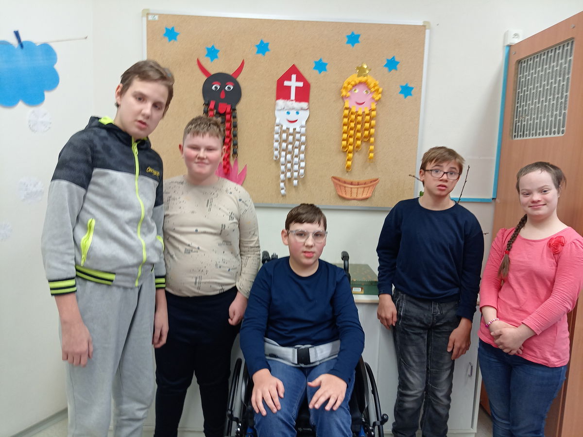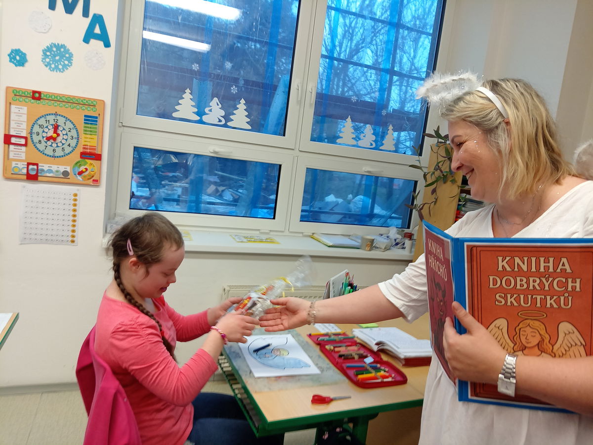 Připravovali jsme výzdobu třídy pro Mikuláše, anděla a čerta. Kreslili jsme obrázky, vyráběli řetězy, aby byla třída hezky vyzdobená. Všichni jsme se moc snažili a práce nás bavila. Naše snažení se vyplatilo, protože nás potom opravdu navštívil Mikuláš, anděl a čert. Přinesli nám sladkou nadílku. Bylo to nezapomenutelné setkání.